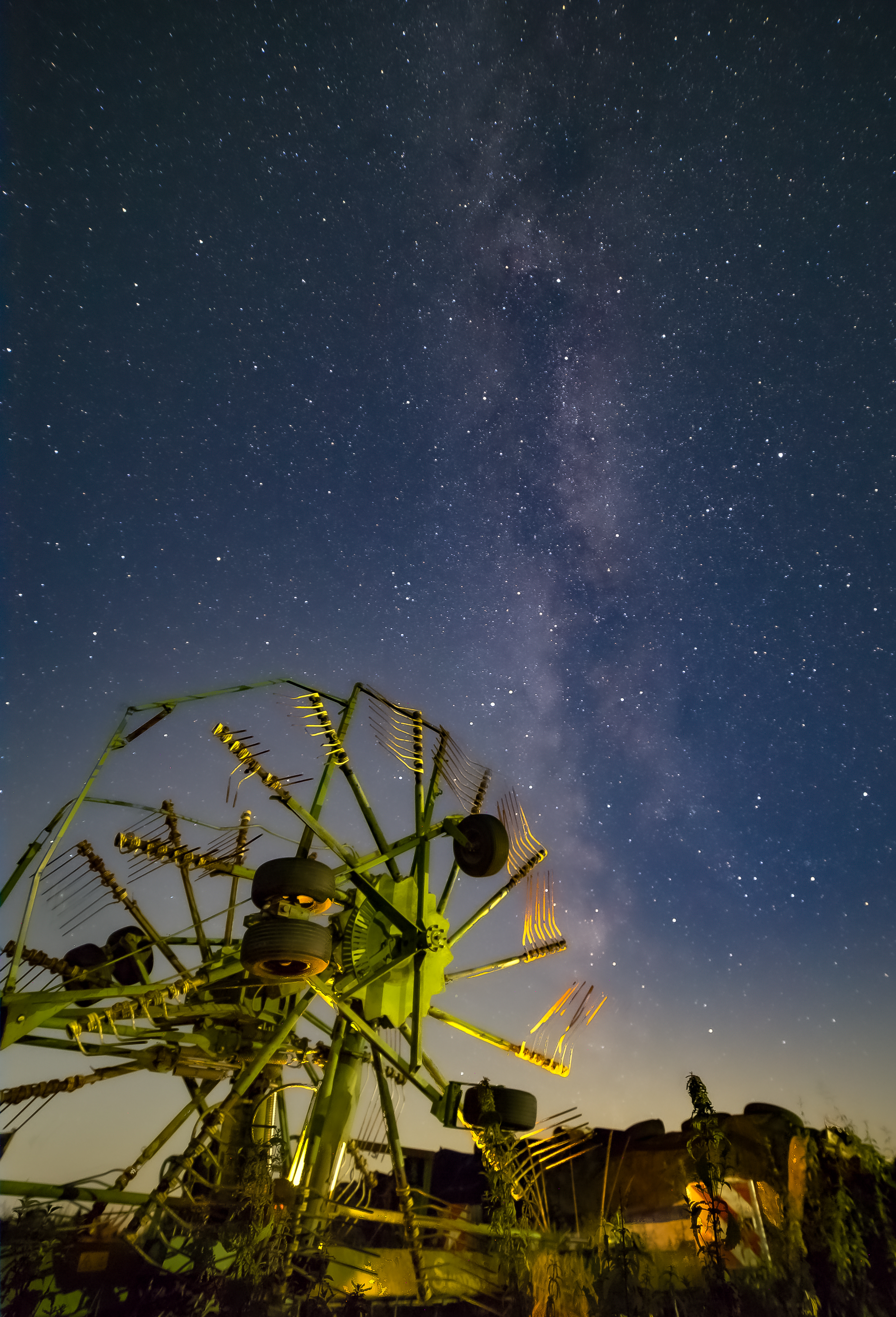 Unter dem funkelnden Band der Milchstraße ruht die alte Maschine – ein stiller Zeuge menschlicher Arbeit auf Erden. Während sie schweigt, erntet der Himmel seine eigenen Sterne.