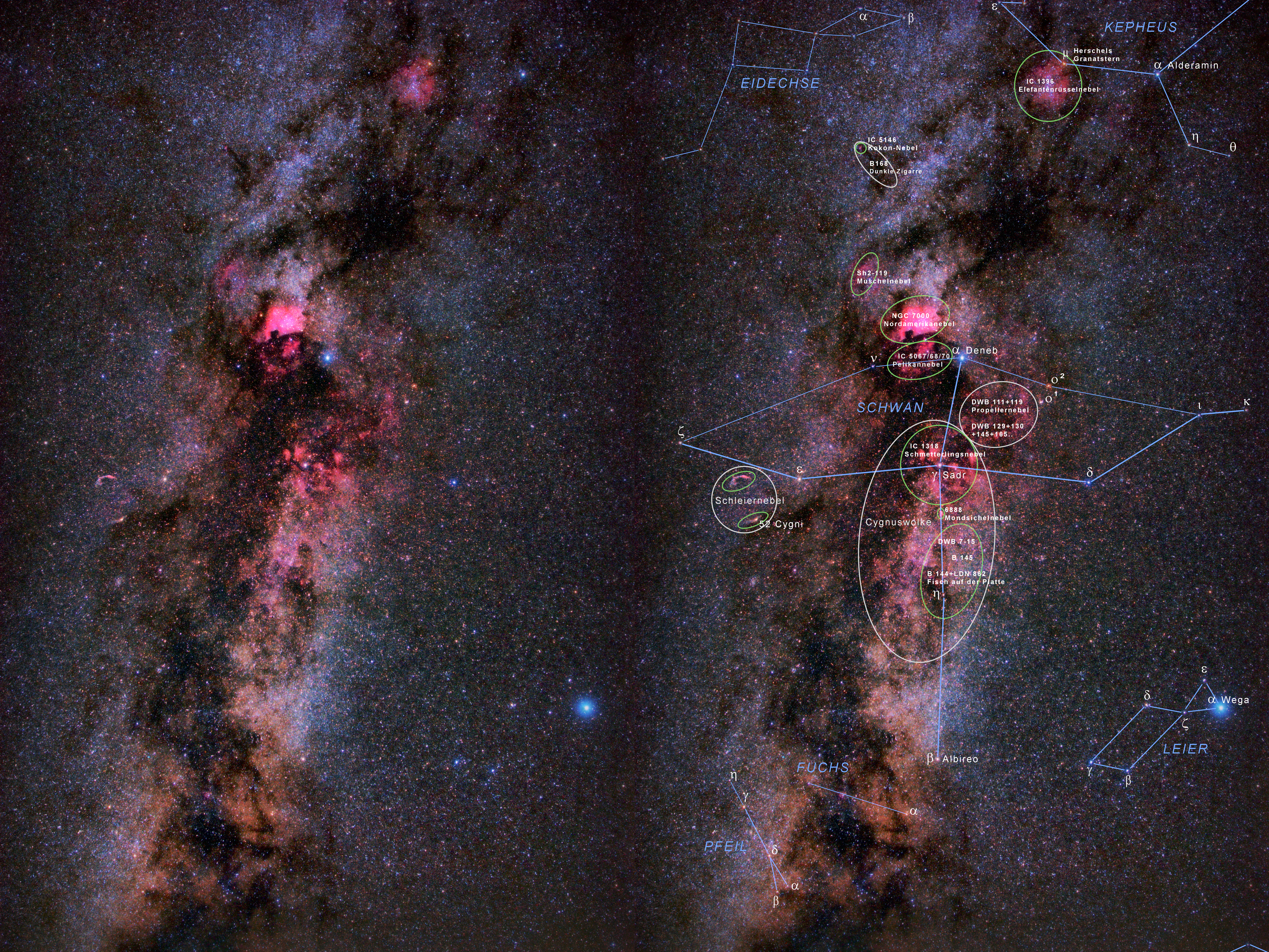 Mitte Oktober dieses Jahres gab es eine der wenigen richtig sternenklaren Nächte im Sauerland, um noch den Flug des Schwans entlang der Milchstraße zu verfolgen, bevor er sich nun in sein Winterquartier zurückziehen wird. Inspiriert vom Artikel »Deep-Sky-Objekte kurz belichtet« aus SuW 2/2020 von Peter Bresseler, versuchte ich in dieser Weitfeldaufnahme möglichst viele Details mit einer herkömmlichen DSLR in vielen kurzen Einzelbelichtungsschritten herauszuholen. Die Kartierung des Schwans, sowie der fünf umgebenden Sternbilder und deren Leitsterne und Nebel erfolgte anhand der Karten der IAU und des Interstellarum DeepSkyAtlas.