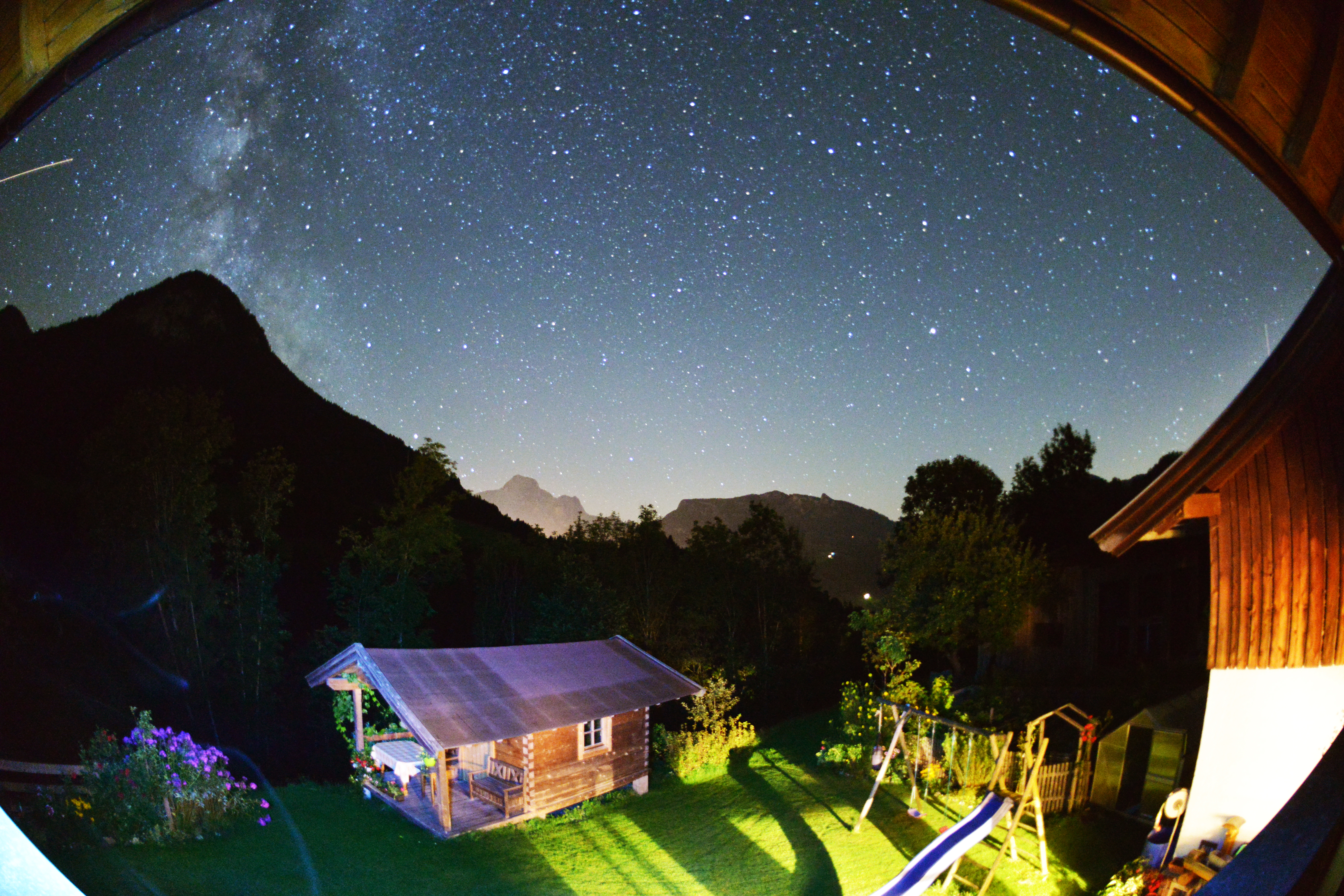 Mit einem Fisheye vom Balkon eines Ferienhauses fotografiert mit Nikonkamera DF 2,8/16. Das Licht kam vom Haus. Zeitaufnahme mit ca. 90 sec. ASA 200