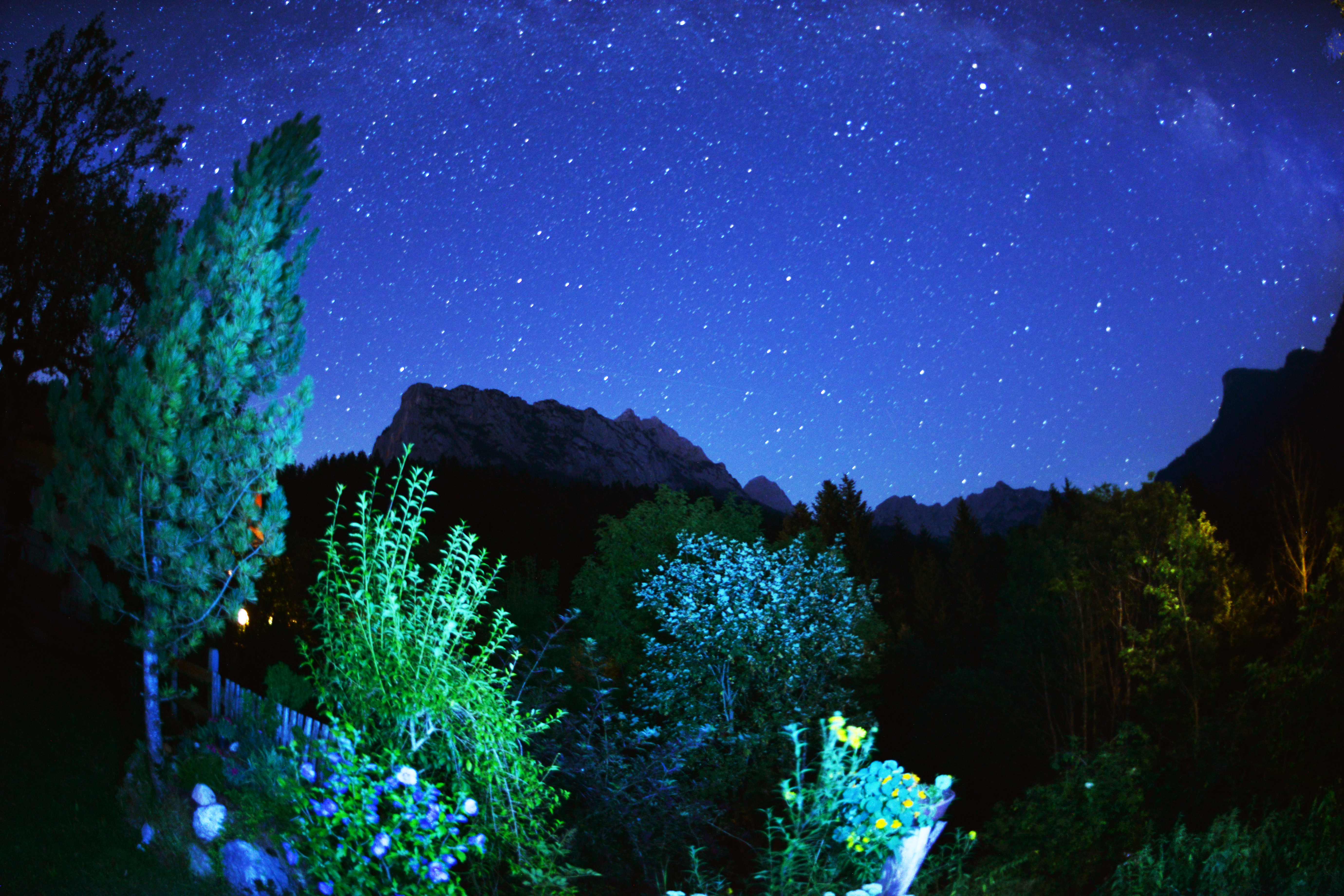 Sternenhimmel über Mayrberg. Vorne Pflanzen und Büsche mit der Taschenlampe zusätzlich beleuchtet.