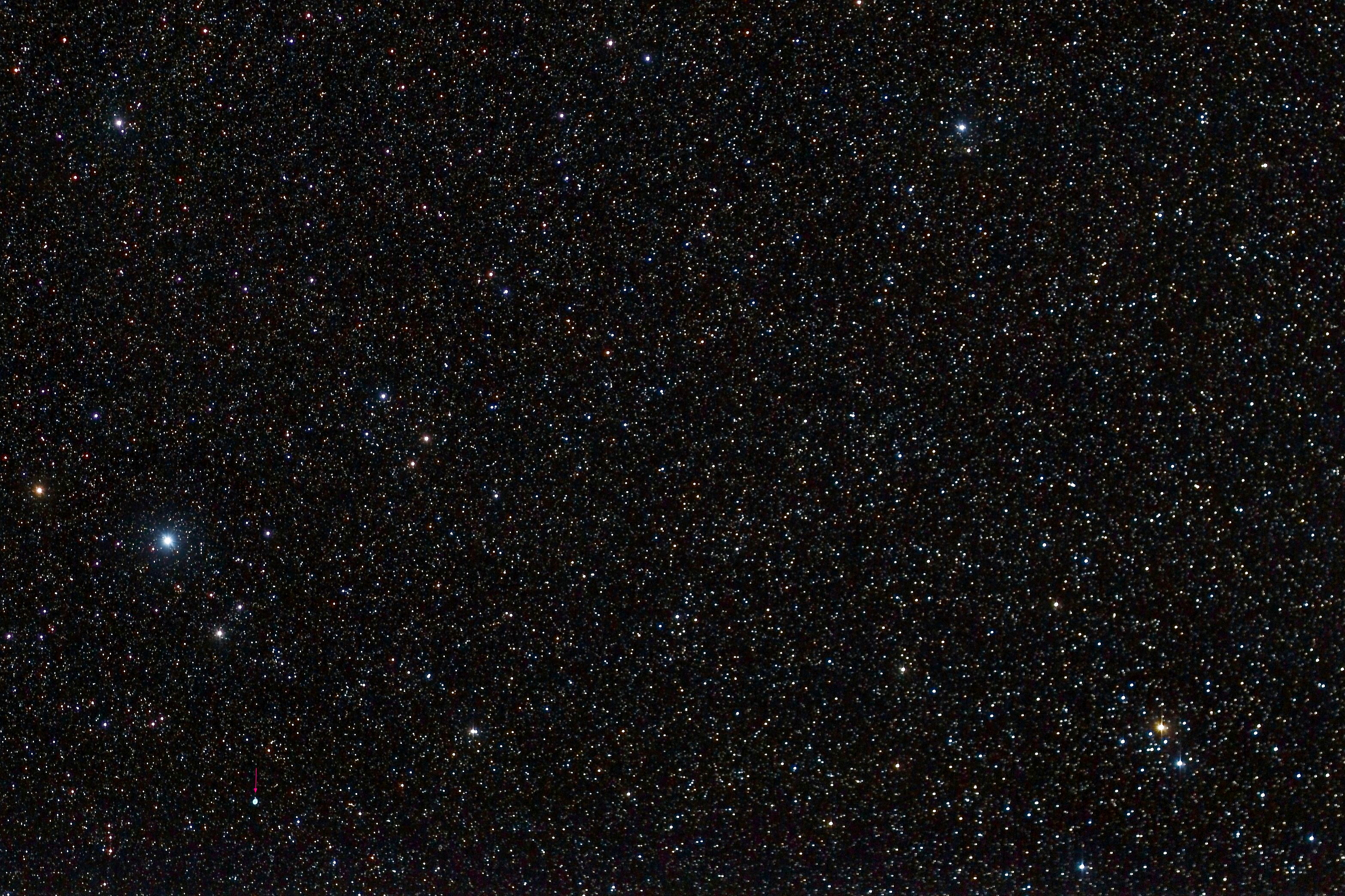 Dieses Bild zeigt den unteren östlichen Teil des Sternbilds Leier mit dem dominierenden Stern Sulafat (Gamma Lyrae). Schräg rechts unterhalb ist der Ringnebel M 57 mit einem Pfeil markiert. Dieser planetarische Nebel verlangt allerdings zur vernünftigen Darstellung doch erheblich mehr Brennweite als 150 mm. In der rechten unteren Bildecke ist noch das bekannte Doppelsternpaar delta 1 und delta 2 Lyr zu finden. Zu diesem Paar zur Info ein schöner Beitrag aus dem WWW: http://star-lodge.astronomie.at/Bildgalerie/Canon_1000D/del_1%20Lyr.html Zur richtigen Orientierung am Himmel müsste das Bild eigentlich 90° nach links gedreht werden.