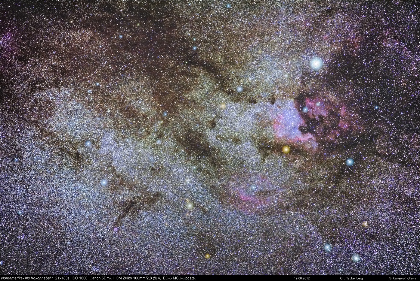 Die Gegend um den Nordamerikanebel wird oft mit astromodifizierten DSLRs und CCDs aufgenommen, um die H-alpha-Nebel besser zu betonen, aber ich finde auch mit einer unmodifizierter DSLR ist die Region durchaus reizvoll.