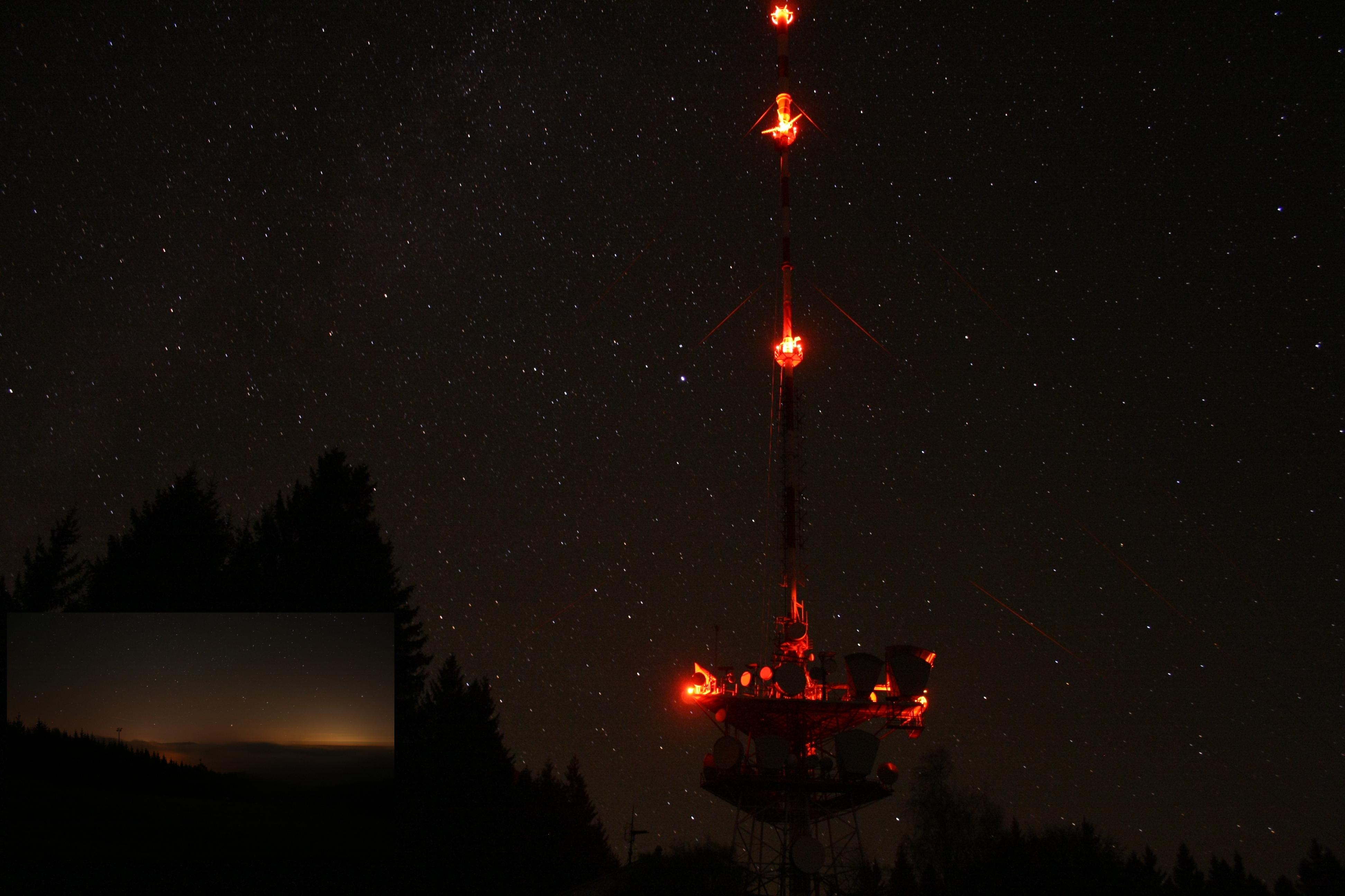 Niederösterreich, Region Wachau ein Inversionswetterlage mit Hochnebel. Am Jauerling, dem 960 Meter hohen Hausberg der Wachau, hatte ich Glück und konnte über dem Nebel einen sternenklaren dunklen Himmel beobachten. Das Foto zeigt den prächtigen Sternenhimmel mit dem Jauerlingsender; das kleine eingefügte Foto den Blick Richtung Südosten mit den Aufhellungen (Lichtverschmutzung) der Städte Krems und St. Pölten.