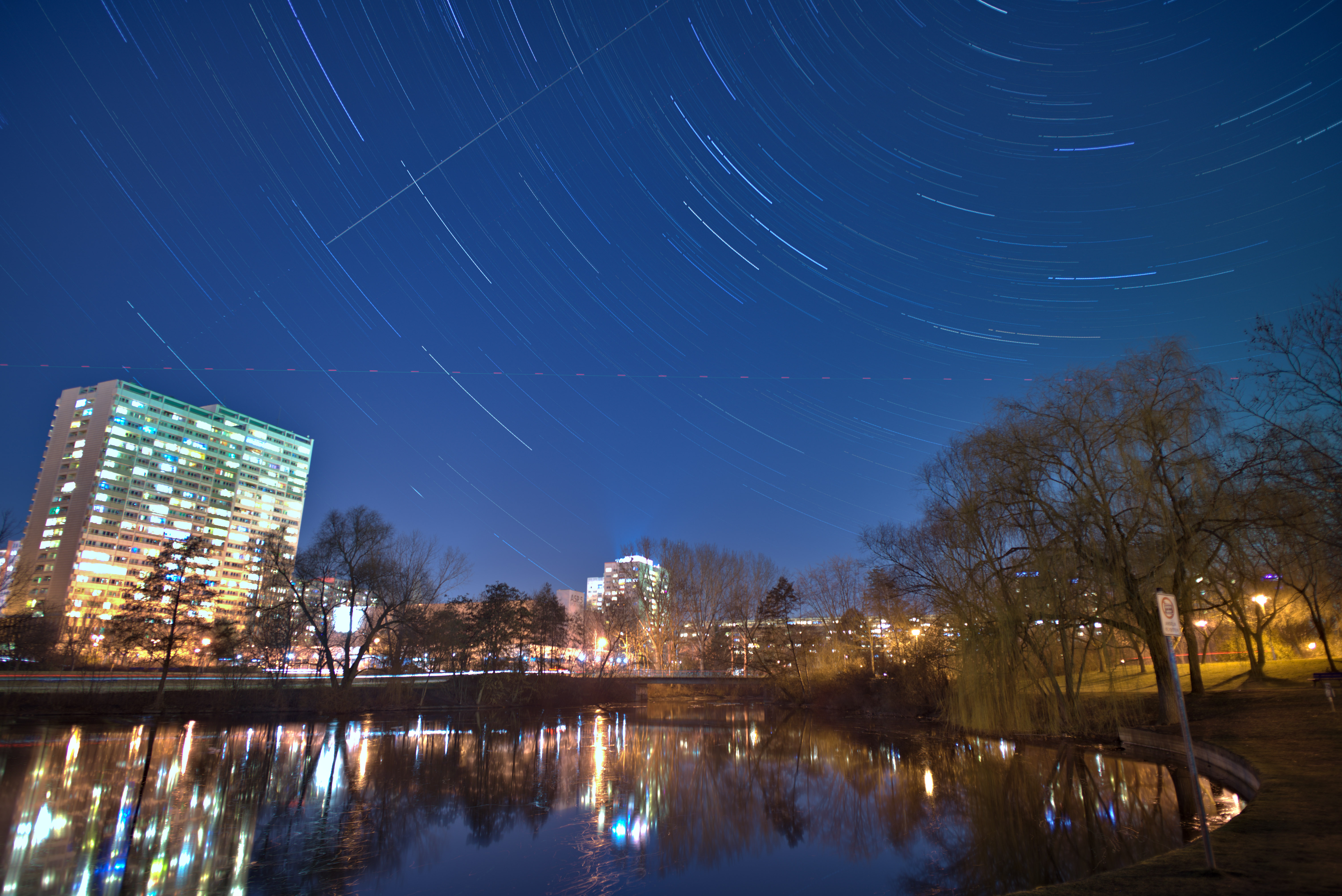 Sternenspuren am Himmel über dem Fennpfuhl in Berlin-Lichtenberg. Die fünf hellen Spuren im Zentrum stammen von den Sternen der Konstellation Kassiopeia namentlich Gamma Cassiopeiae, Schedir, Caph, Ruchbah und Segin.