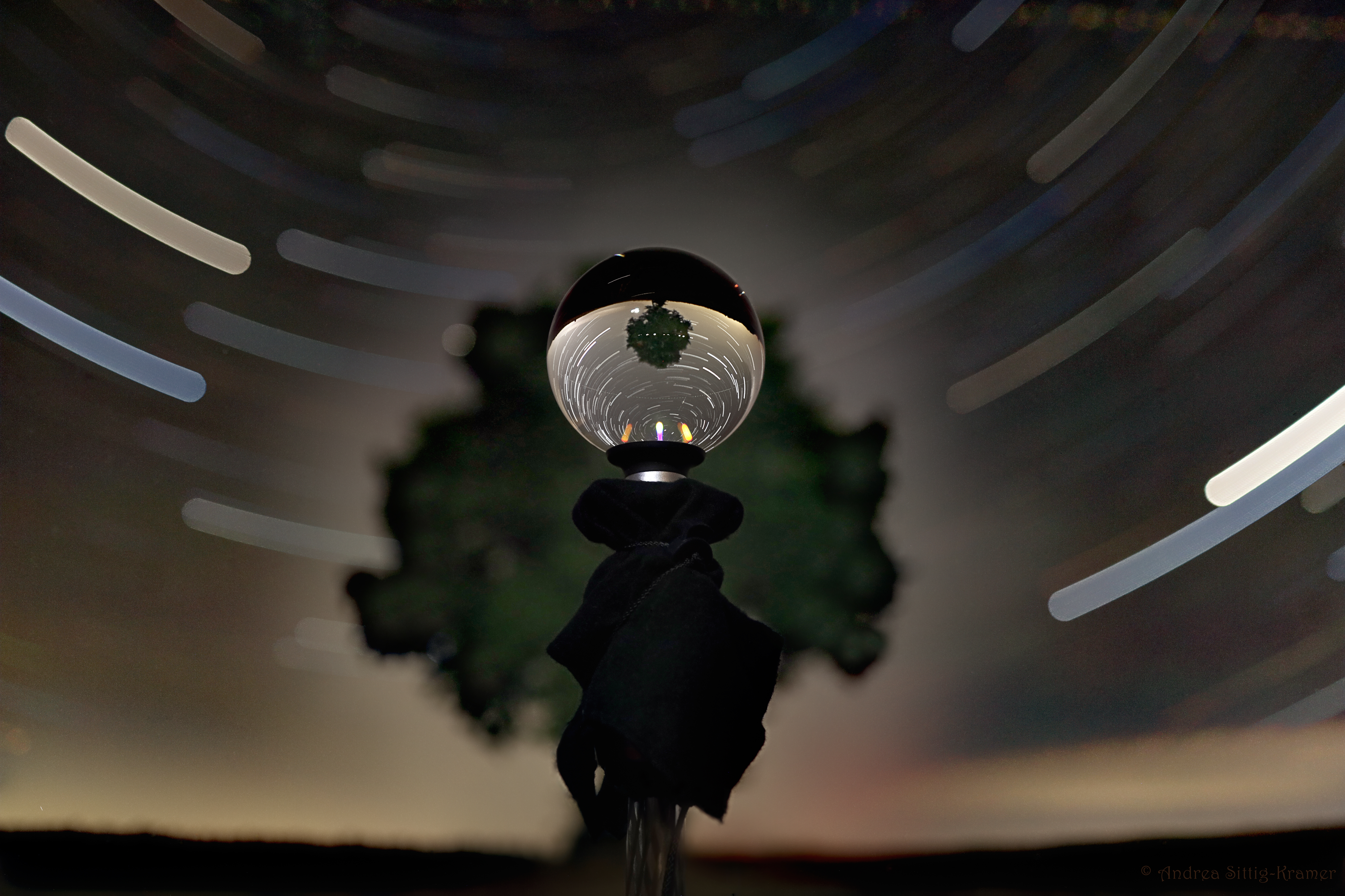 Seit einiger Zeit plane ich ein Strichspurenbild mit und um Polaris im Lensball zu kreieren. Die mondfreie Nacht vom 24./25. August 2025 bot beste Wetterverhältnisse, um diese Idee umzusetzen. Ich wählte einen dunklen Ort auf einem Feldweg im Landkreis Uelzen mit einem alleinstehenden Baum. Ich brauchte viel Zeit und etliche Testaufnahmen, bis die exakte Positionierung von Motiv, Lensball und Kamera stimmig war. Die 133 Aufnahmen fügte ich am heimischen PC mit der Software Sequator zu dem Summenbild zusammen. Die Gesamtbelichtungszeit beträgt somit etwas mehr als eine Stunde. Den Fokus legte ich auf die Strichspuren und den auf den Kopf stehenden Baum in der Glaskugel. Dadurch sind die Sternspuren am Himmel sind deutlich unscharf. Die Unschärfe vergrößert die Breite der Sternspuren extrem und ihre unterschiedlichen Lichtfarben werden überdeutlich sichtbar. Ein wunderschöner Nebeneffekt!