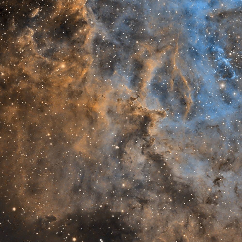 Man nehme einen 140-mm-Refraktor mit einer Brennweite von etwa einem Meter, belichte etwa 14 Stunden im Licht von Wasserstoff, Sauerstoff und Schwefel und vertraue auf die Abbildungsqualität der Optik und die vorhergesagte "stabile Wetterlage", um vielleicht einen Einblick in die Geburtsstätten neuer Sterne zu erhalten. Das Ziel war der Rosetten-Nebel, der sich in einer Entfernung von etwa 5000 Lichtjahren zu uns im Sternbild Einhorn befindet. Die Aufnahme zeigt eine Vergrößerung im Randbereich. Zu sehen sind zahlreiche Globulen, in denen aktive Sternentstehung stattfindet. Das Röntgenteleskop Chandra wies eine Vielzahl junger Sterne nach, die mit ihren hochenergetischen Sternwind die filigrane Struktur des Nebels weiter formen. Die Aufnahme entstand in sechs Nächten zwischen November und Dezember 2016.
