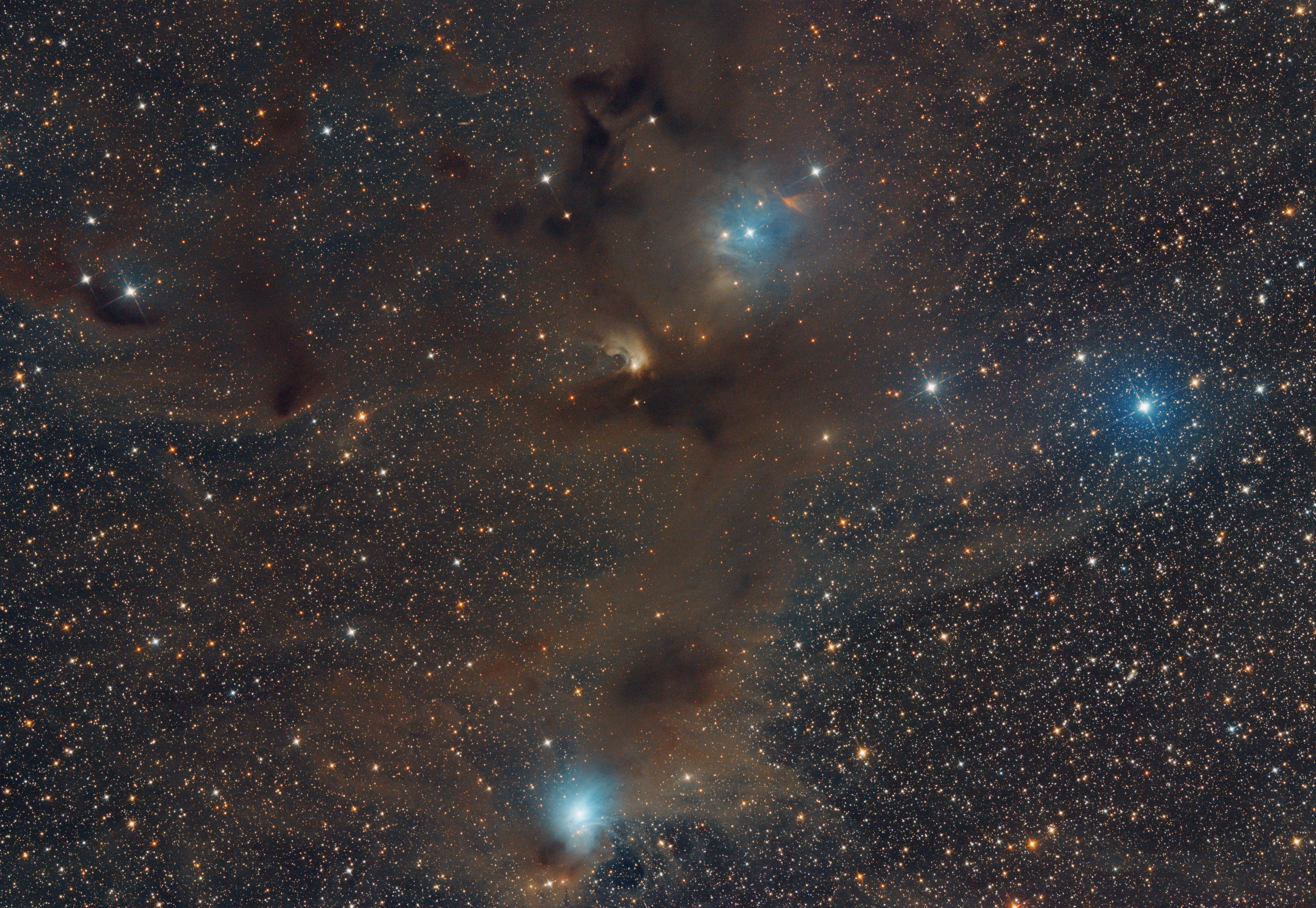 Der Chamäleon-Komplex ist ein großes Sternentstehungsgebiet, das die Dunkelwolken Chamäleon I, Chamäleon II und Chamäleon III umfasst. Es nimmt fast das gesamte Sternbild Chamäleon ein und überlappt mit Apus, Musca, Carina und Octans. Die Wolke Chamäleon I (Cha I) ist mit etwa 160 Parsec eine der nächstgelegenen aktiven Sternentstehungsregionen. Die gesamte Sternpopulation beträgt 200 bis 300 Mitglieder. Die Sternentstehung begann vor drei bis vier Millionen Jahren im südlichen und vor fünf bis sechs Millionen Jahren im nördlichen Bereich. Die Sterne haben ein mittleres Alter von etwa zwei Millionen Jahren. (Wikipedia) Aufnahme am 28. Februar 2025 an der VdS Sternwarte in Namibia mit Takahashi 160D (91 Bilder je 300s mit Astronomik UV/IR Filter), Lacerta 2600C Farbkamera. Operator: K. O. Detken