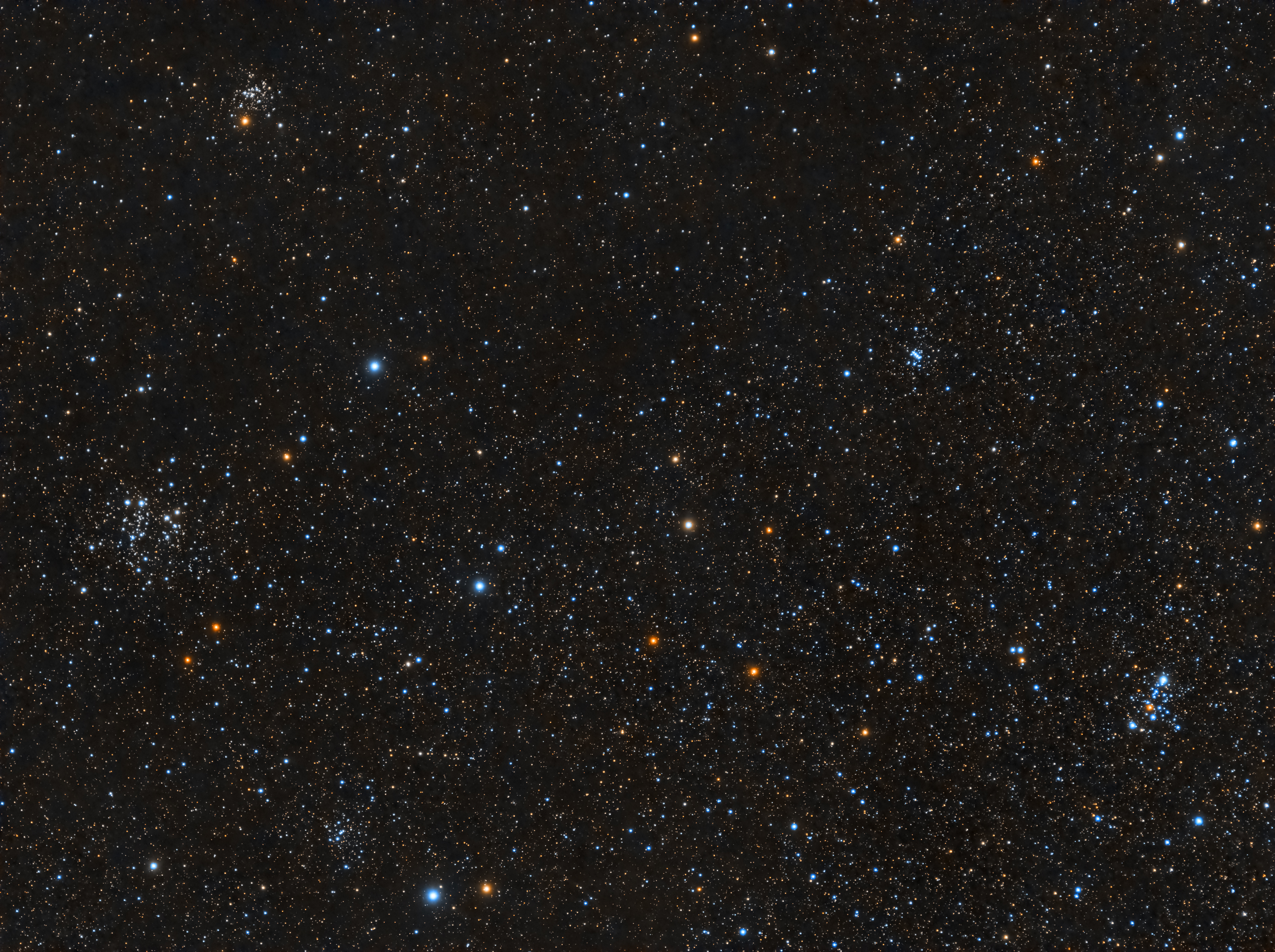 Der Teil des Himmels, den ich abgebildet habe, liegt direkt unterhalb der imaginären Linie, die die Sterne Segin (ε Cas) und Ruchbah (δ Cas) verbindet, d. h. die ersten beiden Sterne des »W«, welches das Sternbild Kassiopeia kennzeichnet. In diesem Bild, das mit einer Brennweite von 480 Millimetern aufgenommen wurde, sind fünf Sternhaufen zu sehen: NGC 654, NGC 663 (oder Caldwell 10), NGC 659, Collinder 15 und Messier 103 (oder NGC 581).