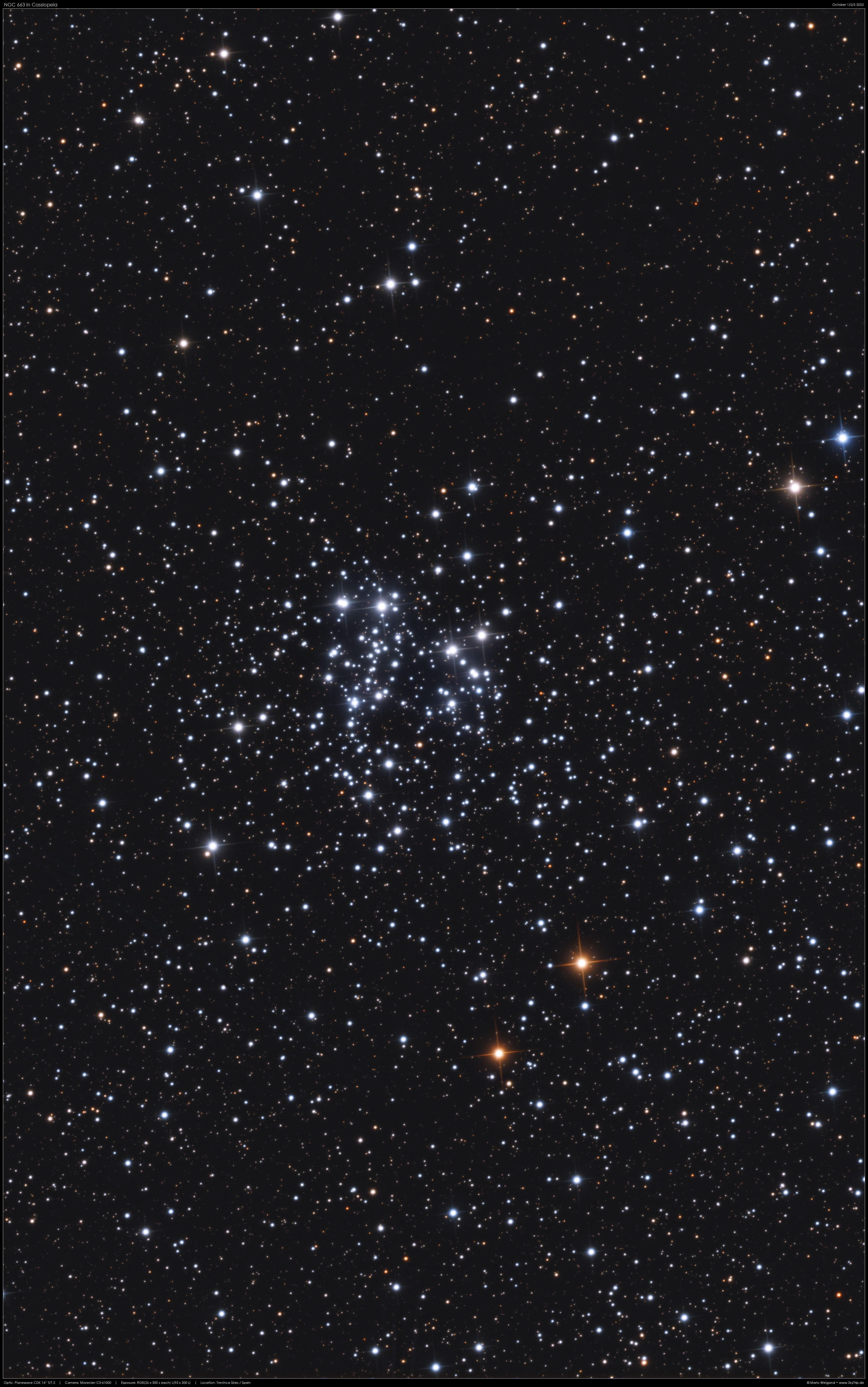 NGC 663 ist ein offener Sternhaufen im Sternbild Kassiopeia, hat einen Durchmesser von rund 16 Bogenminuten und eine scheinbare Helligkeit von +7,1 mag. http://www.skytrip.de