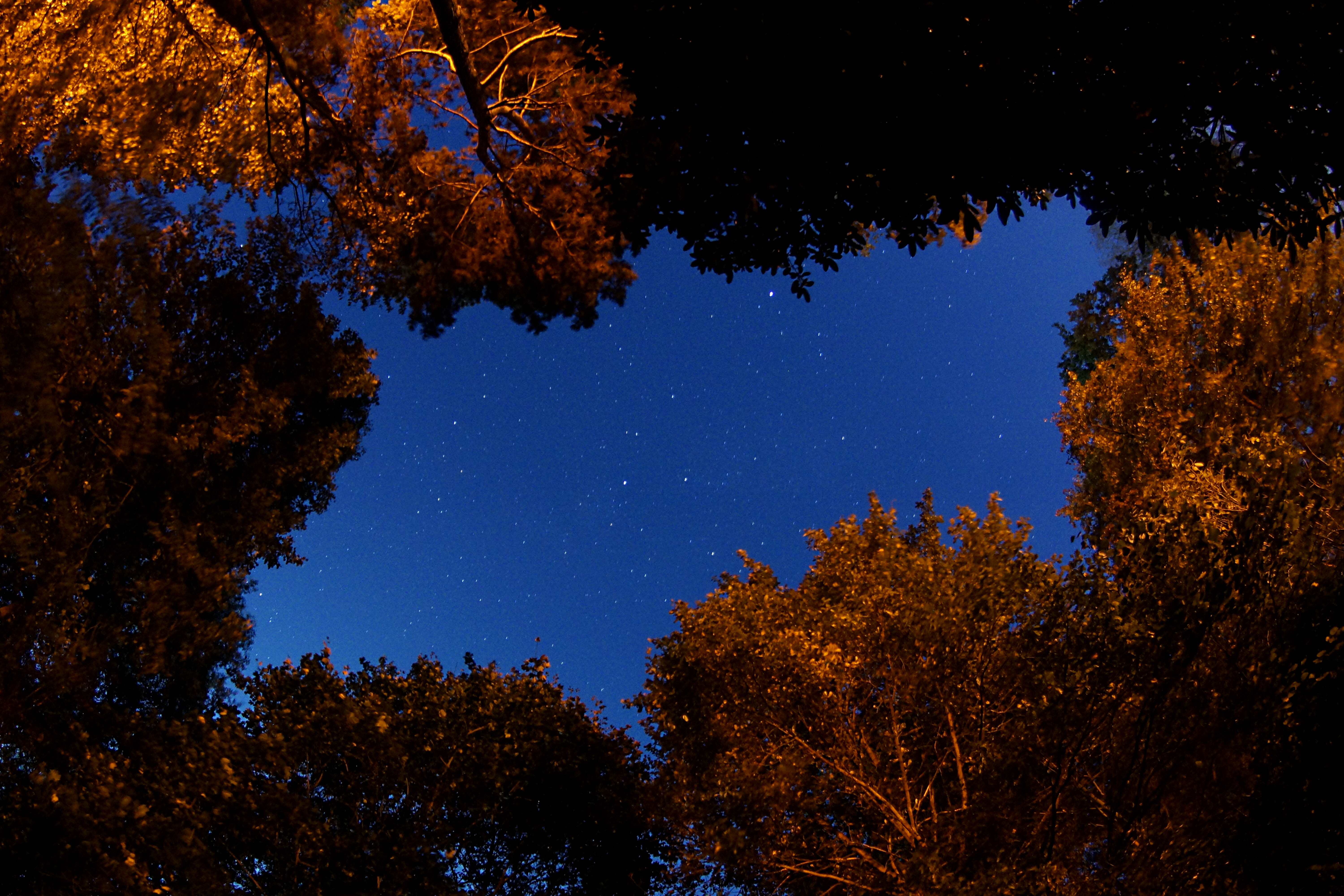Zum Zeitpunkt der Aufnahme nach Ende der Dämmerung stand der Fast-Vollmond bereits neun Grad über dem Horizont und begann den Himmel zu erhellen. Durch Einstellung der Farbtemperatur auf "Glühbirne" wirkt der Himmel farblich wie zu Dämmerungsbeginn, und die von den Natriumdampflampen nur recht schwach angestrahlten Herbstblätter reflektieren das Licht stärker als erwartet.
