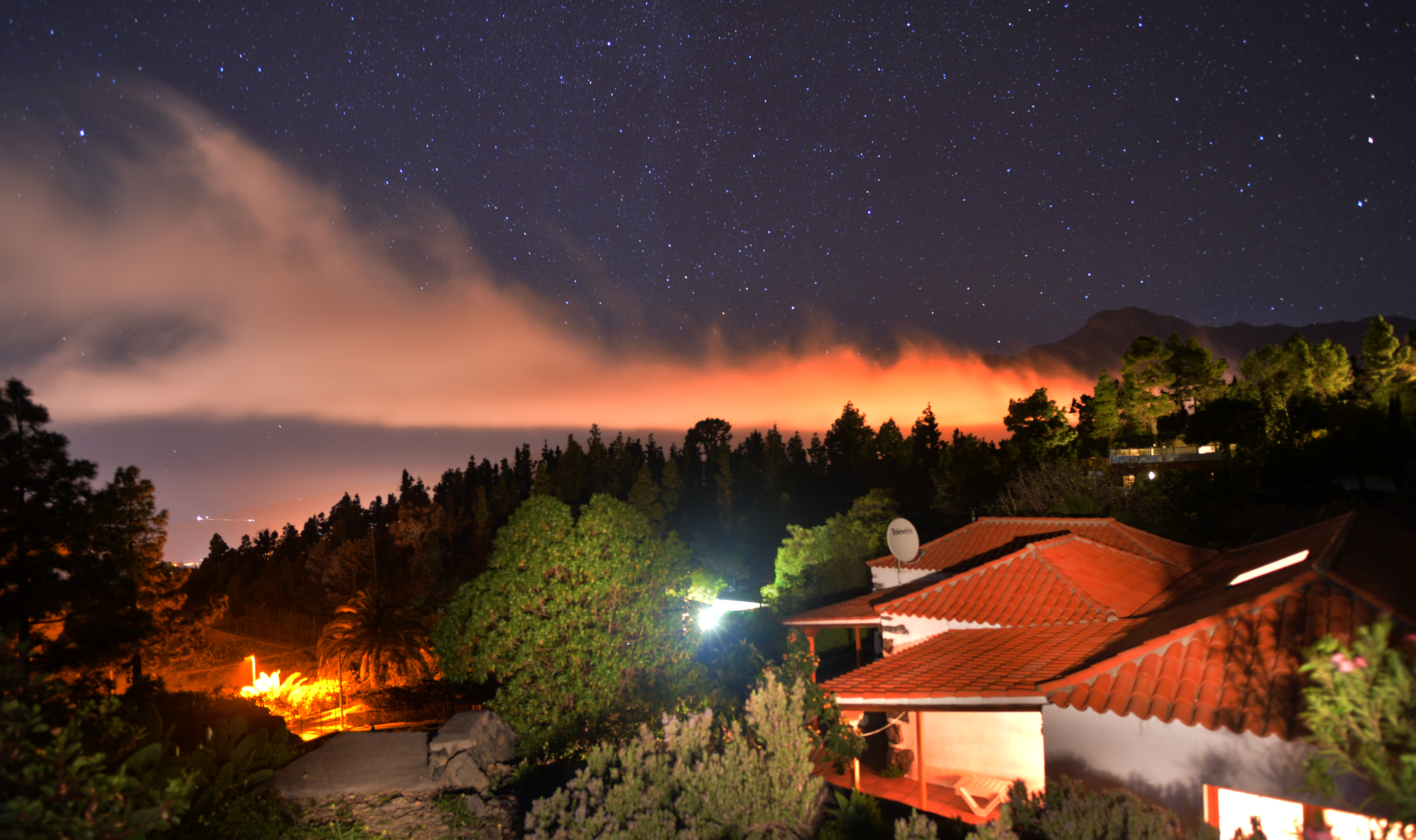 Sternhimmel über La Palma bei Tacande nahe El Paso mit Wolken, Ferienhaus (vorn) und Bäume mit Taschenlampe beleuchtet, auch das Dach.