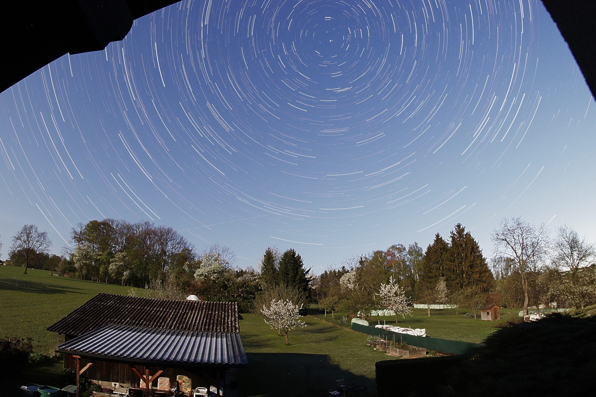 Der Ostervollmond tief im Westen beleuchtete die blühenden Kirschbäume und meine Kuppel im Garten. Ich wollte ein avi-Video aufnehmen und nahm dazu von 3 Uhr bis zum Dämmerungsbeginn um 4 Uhr 180 Frames à 20 sec auf. Die Schatten der Bäume und der Gebäude ziehen dabei über den Wiesenboden und die Sterne darüber ihre Kreise. (Zu sehen auf meiner HP: "Walter Primik Flickr")