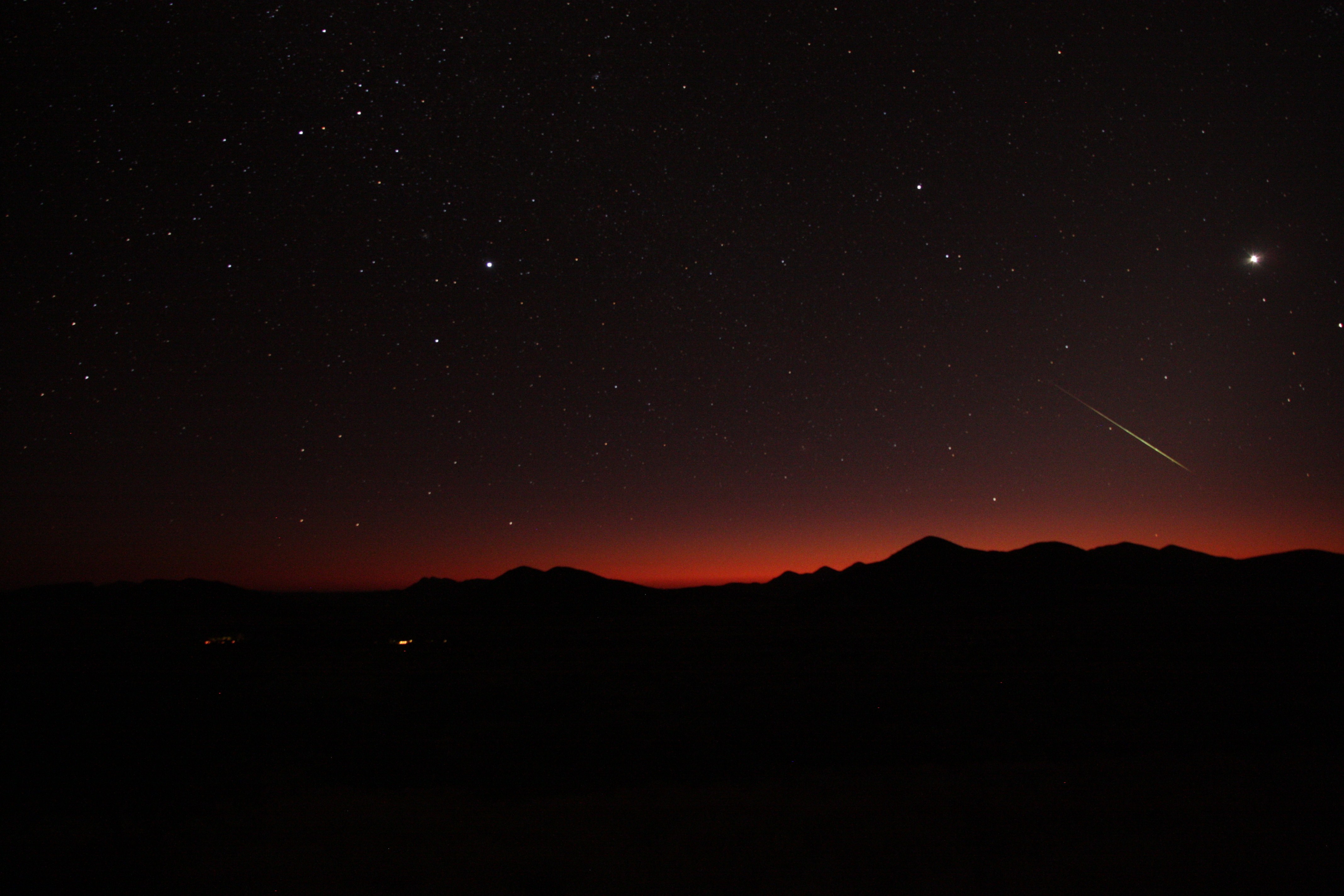 Über den Zebrabergen der Farm Rooisand Namibia hatte ich das Glück, eine Sternschnuppe zu erwischen. Mit dabei sind Venus (rechts) und die Sternbilder Canis Minor und Canis Major.