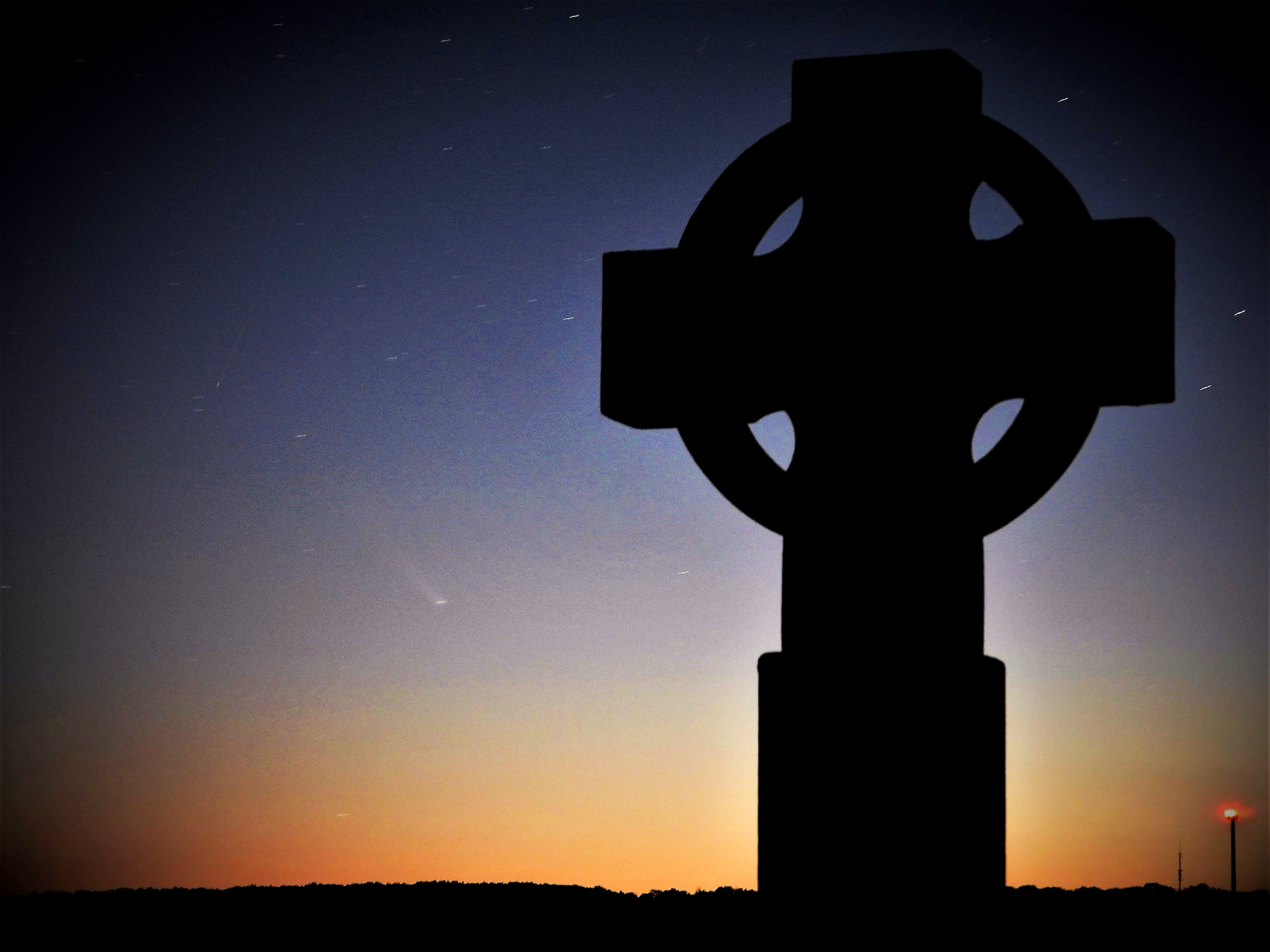 Um 4 Uhr am 22. Juli 2020 war der Komet NEOWISE kaum noch neben einem keltischen Steinkreuz zu sehen, als eine kleine Sternschnuppe neben ihm verglühte. Einige Minuten später war NEOWISE nicht mehr sichtbar.