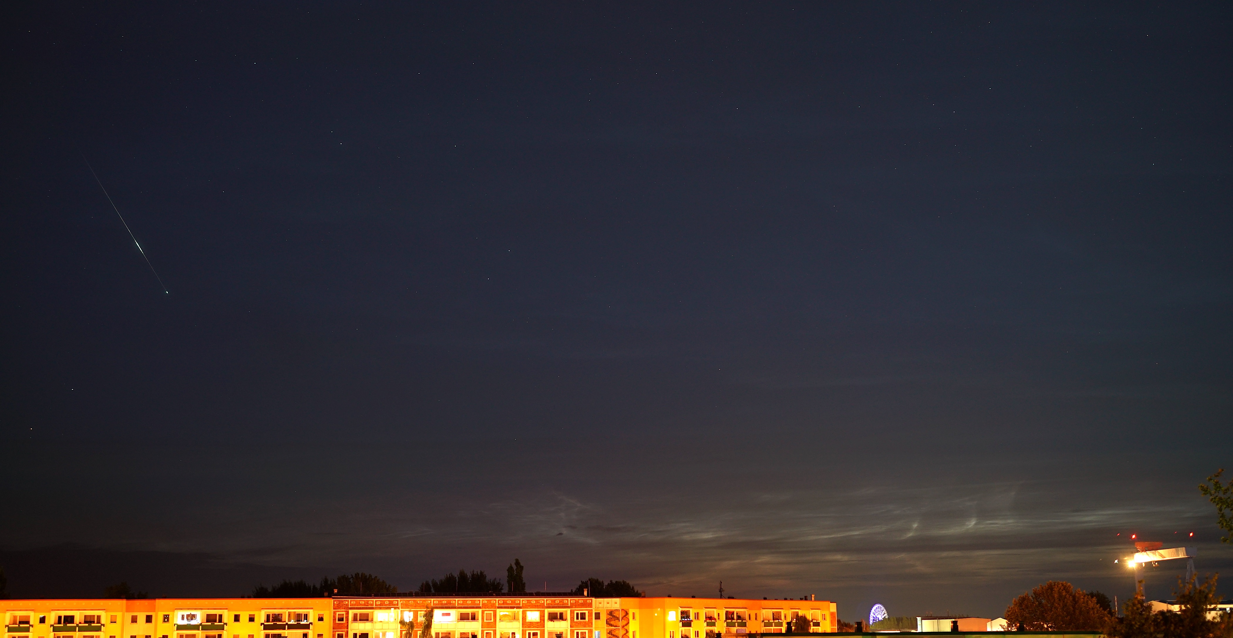 Hier im Norden Deutschlands ist ein guter Standort zur Beobachtung leuchtender Nachtwolken (NLC - Noctilucent Clouds). Neben der visuellen Beobachtung kommen bei mir teils aber auch automatisch laufende Kameras zum Einsatz - jede Nacht durchgehend beobachten ist halt nicht drin ;-) Letzte Nacht brachte ein Kontrollblick für die 2. Nachthälfte emporkommende NLC zum Vorschein, welche immer prächtiger wurden. Also hieß es "dran bleiben". Während die Kamera mit dem 50-mm-Objektiv im Intervall von 15 Sekunden Aufnahmen machte, konnte auch eine recht helle Sternschnuppe zusammen mit den leuchtenden Nachtwolken festgehalten werden.