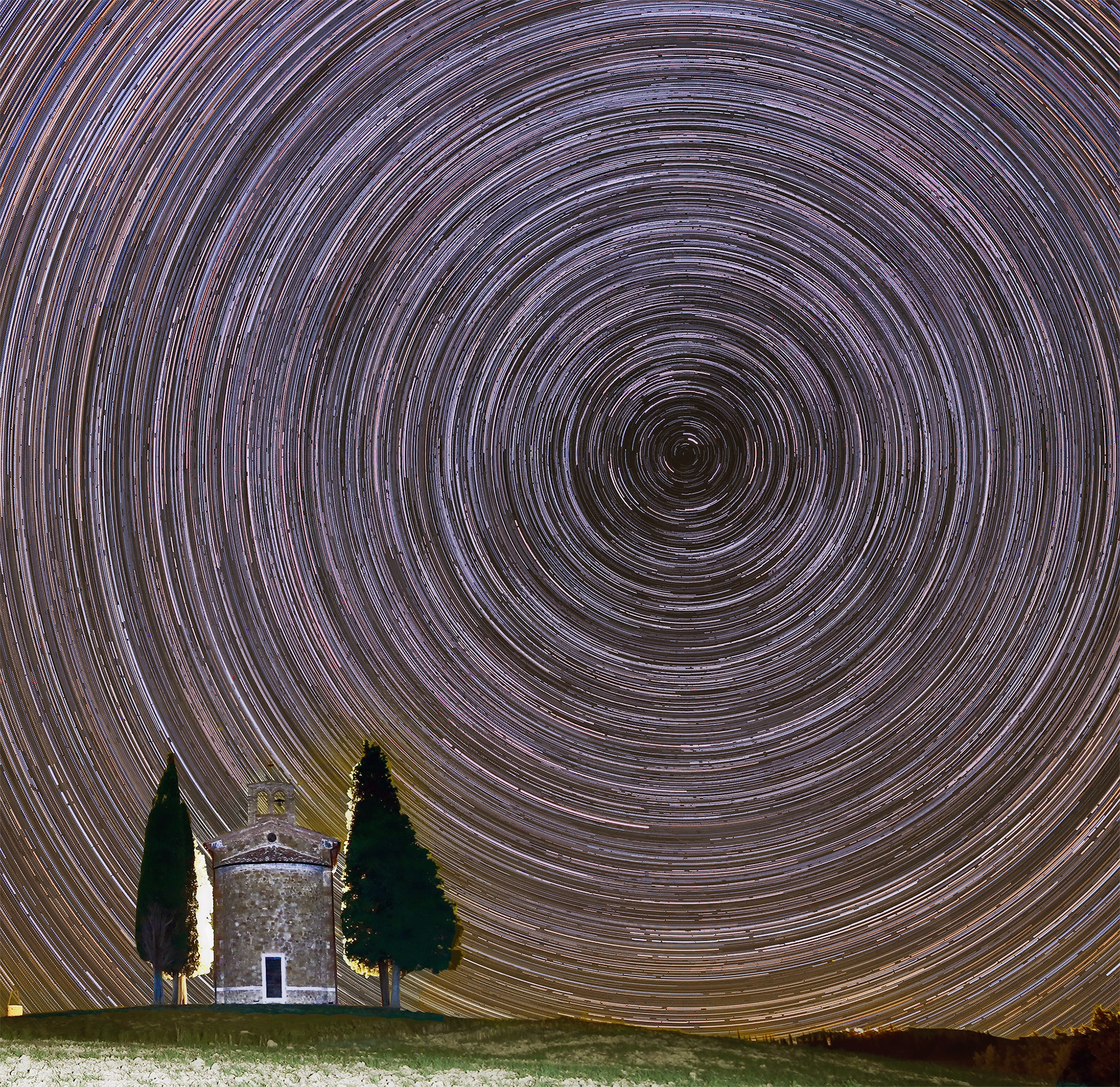 Leserbilder Astronomie: Sternspuren – Cappella della Madonna di Vitaleta – Italien