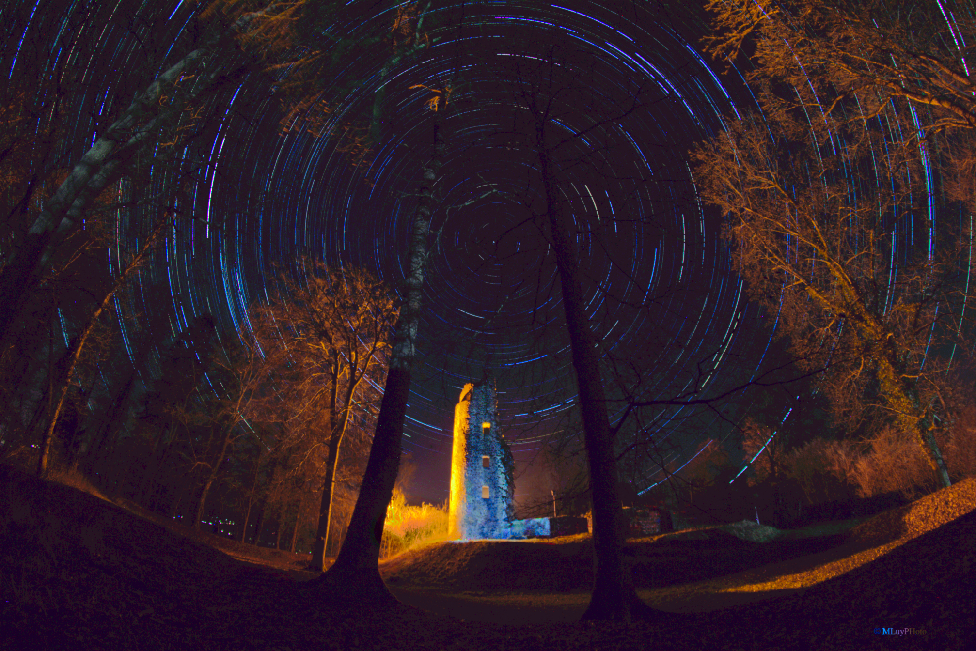 Die Burgruine Dagstuhl befindet sich auf einem Höhenrücken bei Dagstuhl, Ortsteil der saarländischen Gemeinde Wadern im Landkreis Merzig- Wadern. Erwähnt wird die Höhenburg erstmals um das Jahr 1290. Ihr Gründer und Erbauer ist Boemund von Saarbrücken. Die Burg diente als Bollwerk zur Sicherung der Herrschaft des Erzbischofs und Kurfürsten von Trier. Auch heute noch ist die Anlage sehr beeindruckend. Weithin sichtbar ragt immer noch einer der Burgtürme ca. 20 Meter in die Höhe. Auf dieser Aufnahme geht der Blick nach Norden. Es zeigt den Himmelsnordpol mit dem Polarstern im Zentrum. Da die Kamera nicht nachgeführt und damit auch die Erdrotation nicht ausgeglichen wird, entstehen die Sternspuren. Leider erkennt man hier auch das zunehmende Problem der nächtlichen Landschaftsfotografie. Und es stellt sich die Frage: Warum müssen solche Gebäude die ganze Nacht beleuchtet werden? Nachts, wenn alles schläft...?