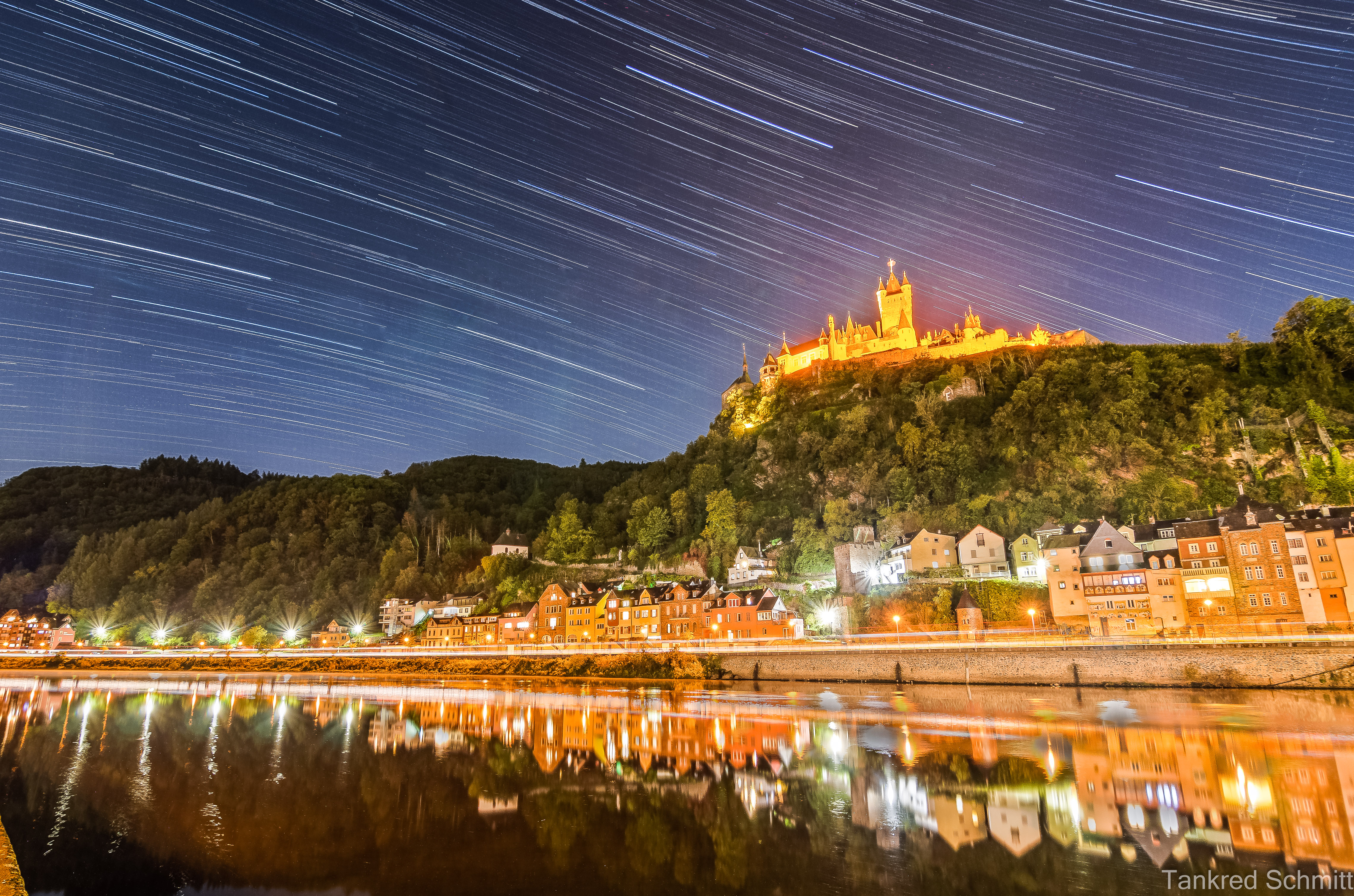 Dieses Foto zeigt die schönen Spiegelungen der Cochemer Altstadt, die von der Reichsburg überragt wird, weiter links sieht man die Marienkapelle. Die Blickrichtung der Aufnahme ist Richtung Westen, was man auch an der Form der Sternspuren erkennen kann. Die Sterne nah am Himmelsäquator verursachen dabei die geraden Striche, die genau im Westen auf den Horizont treffen. Die Sterne der nördlichen Hemisphäre darüber bilden nach ober geöffnete Spuren, die in der Nähe des Himmels-Nordpol die hierzulande oft fotografierten Kreise um den Polarstern bilden, während die Sterne der südlichen Hemisphäre links unten nach unten geöffnete Spuren verursachen. Belichtung: 30*120s 11mm f\5.6 ISO400 + 1x 60 s + 1x 30s für ein HDR.