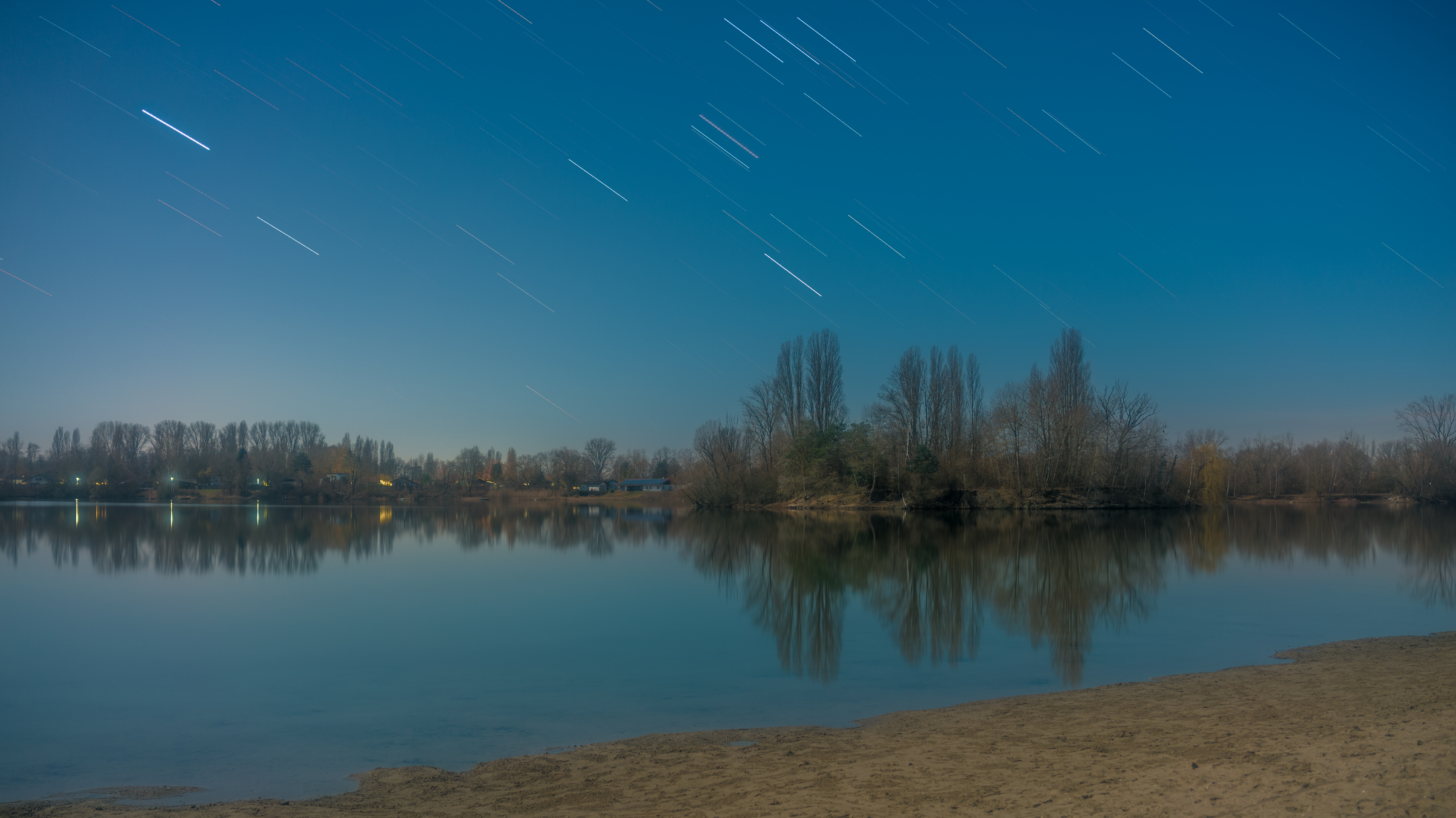 Bei Vollmondlicht und nahezu völliger Windstille konnte ich diese Landschaft mit Sternspuren am Binsfeldsee nahe Speyer aufnehmen.
