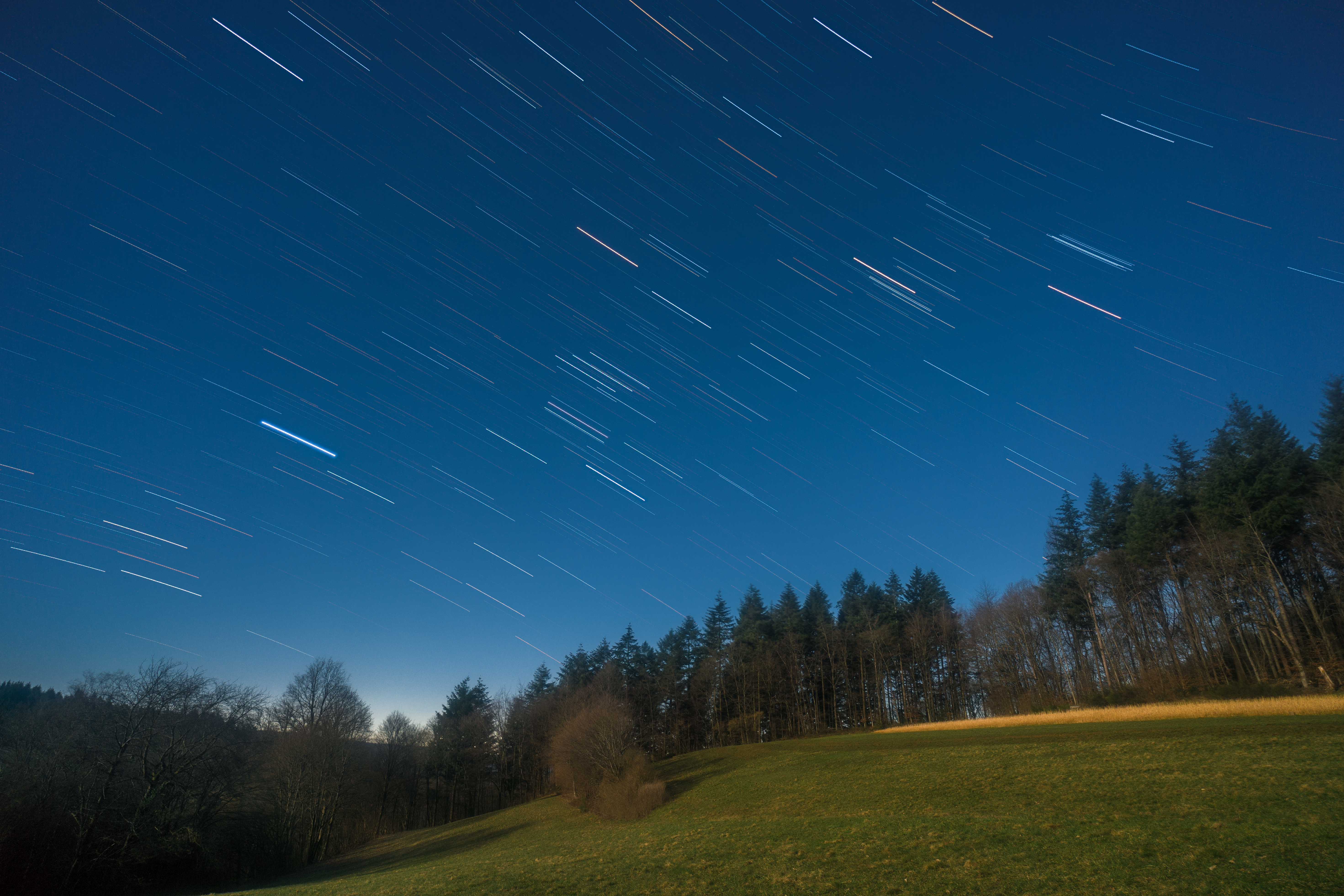 Bei (fast) Vollmondlicht konnte ich bei Lampenhain im Odenwald diese Landschaft mit Sternspuren aufnehmen.