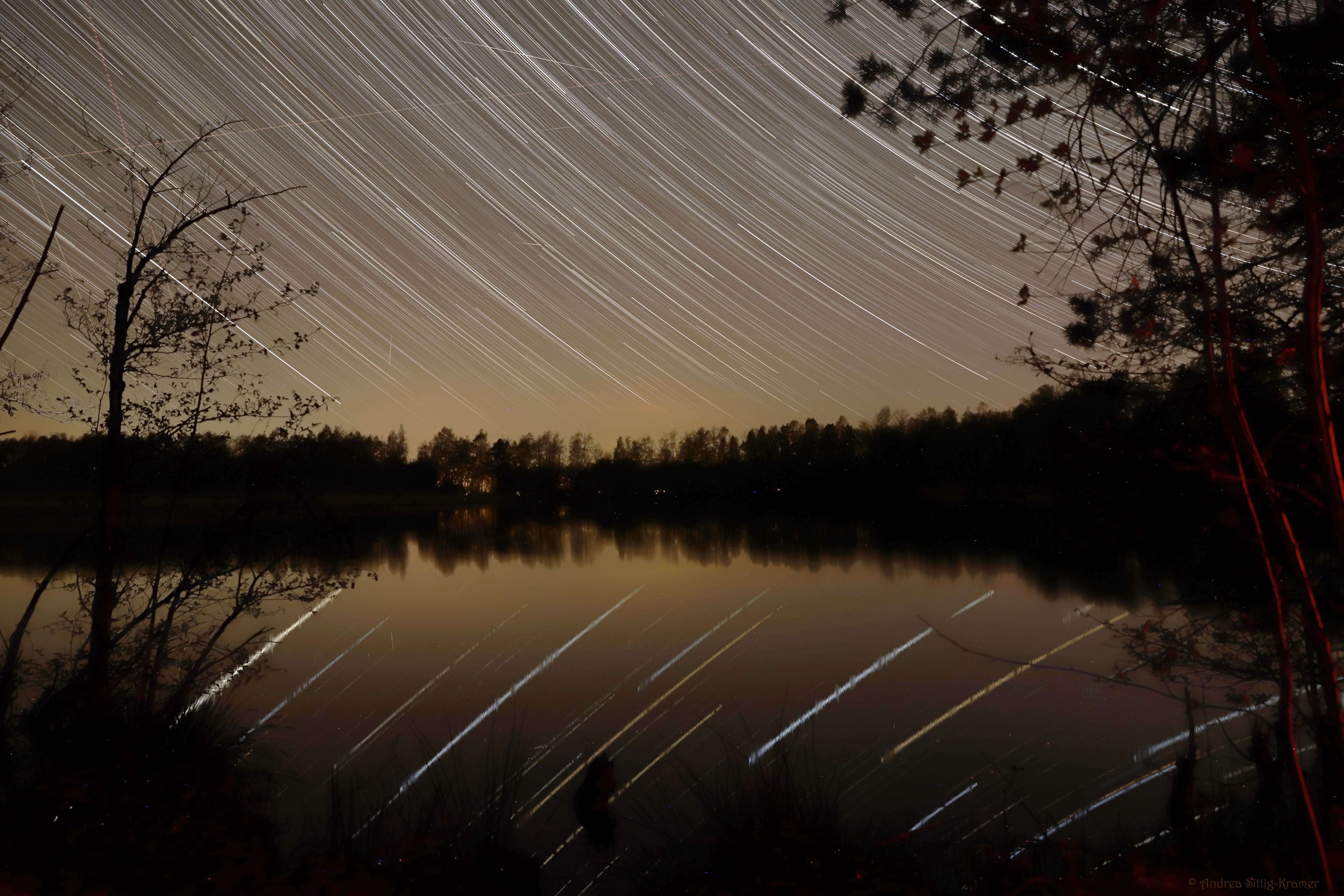 Am 28. April 2022 herrschten in der Südheide optimale Wetterbedingungen für die Himmelsbeobachtung. Auf der Suche nach einem See, in dem sich die Sternenlichter auf der Wasseroberfläche spiegeln, fuhr ich zum Oldendorfsee in der Südheide. Dort nahm ich knapp 150 Fotos mit Blickrichtung Westen auf, die ich später am heimischen PC mit dem Programm »Startrails« zu einem Summenbild zusammenfügte. Das Ergebnisfoto hat eine Gesamtbelichtungszeit von einer guten Stunde. Neben den Lichtspuren der Sterne sind sechs Flugzeug- und mindestens drei Satellitenspuren deutlich zu sehen. In der linken Bildmitte ist außerdem das Aufleuchten eines Meteors und seine Spiegelung im See sehr schön zu erkennen.