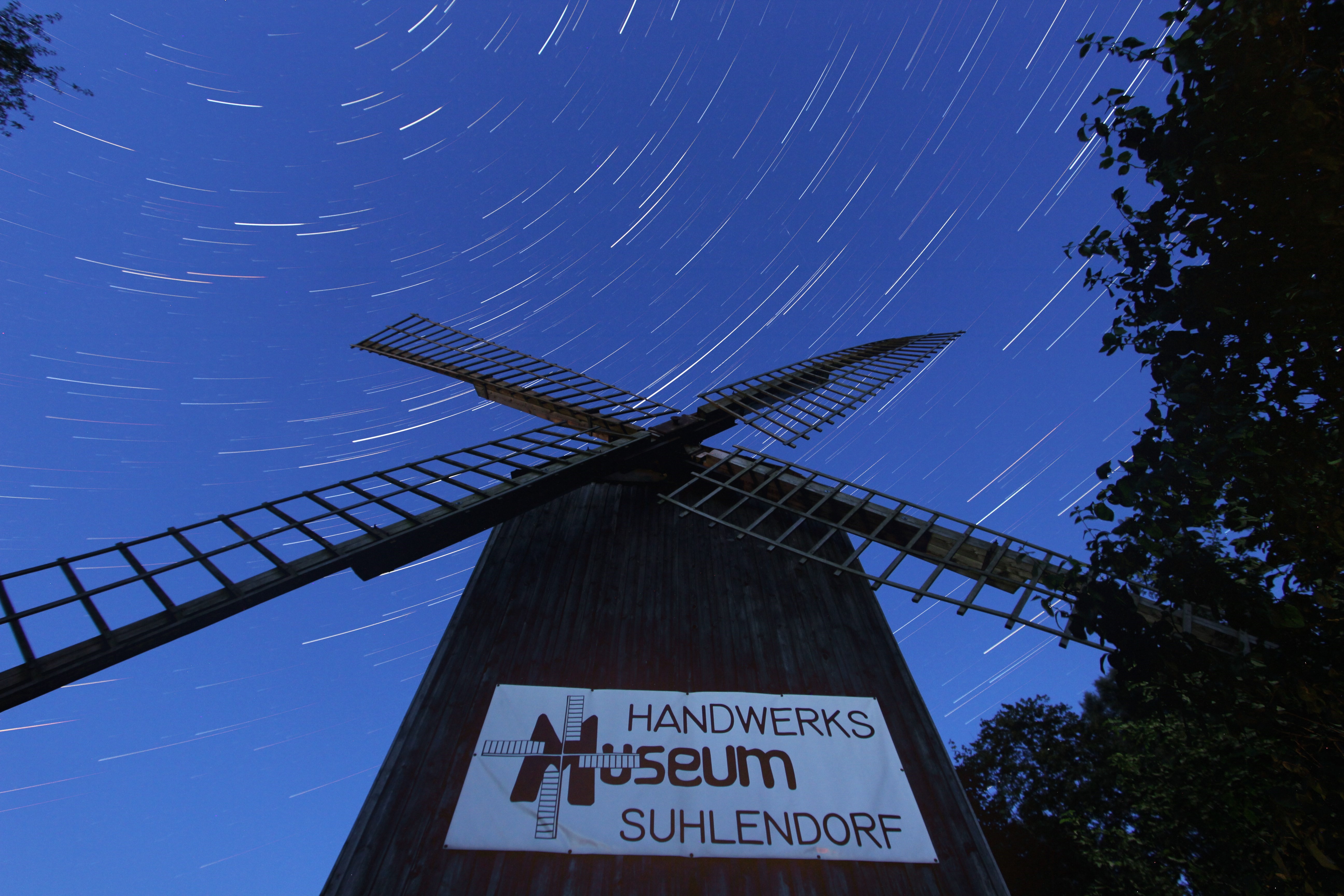 Die Kaisermühle, am Ortseingang von Suhlendorf im Landkreis Uelzen, hatte ich mir schon vor längerer Zeit als Vordergrund für ein Strichspurenbild ausgewählt. In der Nacht vom 3. auf den 4. Juli 2021 realisierte ich dieses Vorhaben. Die 275 Einzelaufnahmen fügte ich mit dem PC-Programm Startrails zusammen. Das ergibt eine Gesamtbelichtungszeit von gut eineinhalb Stunden. Die Mühle erwies sich in der Tat als sehr fotogen. Ihre vier mächtigen Flügel sind fixiert und nicht mehr beweglich. Aber die Sternspuren zeigen, dass die Erde sich unaufhörlich dreht.