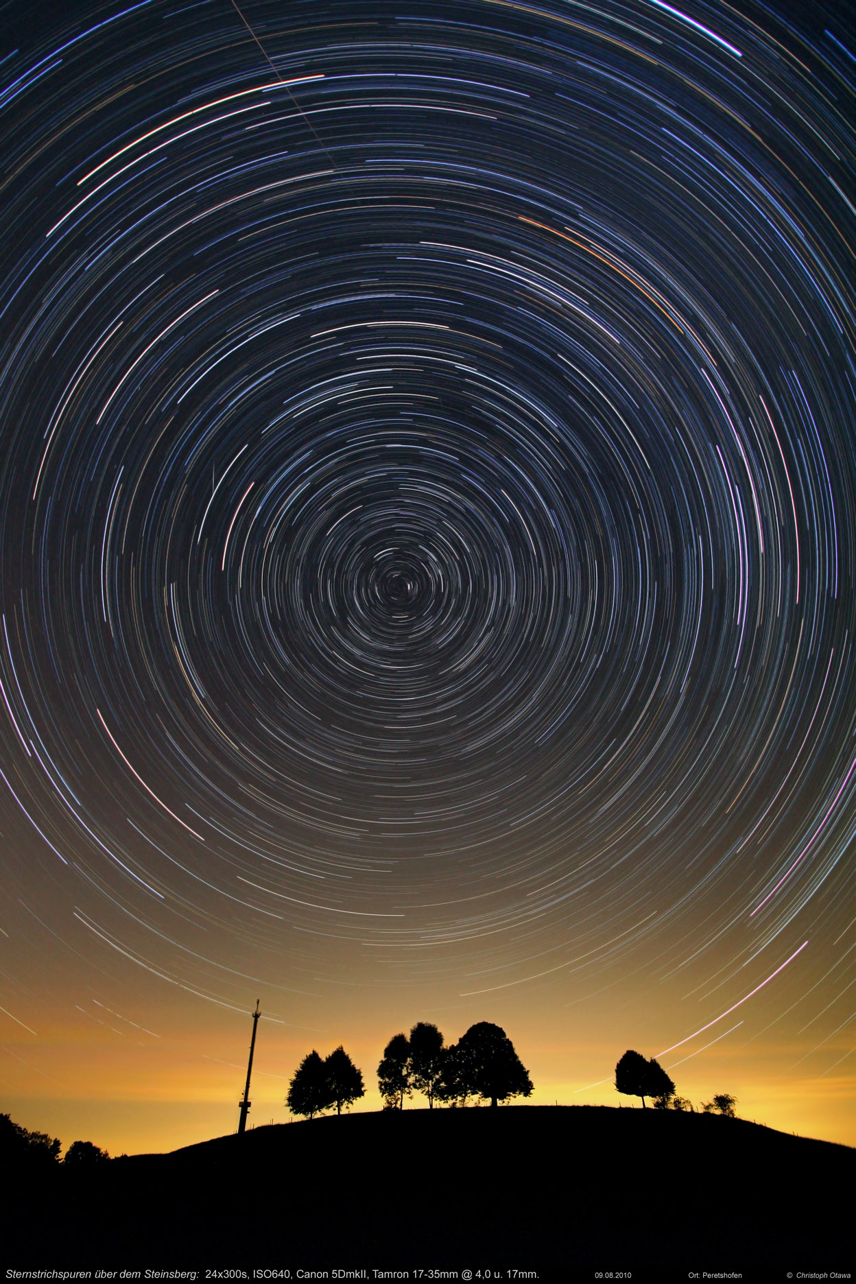 Habe eine der wenigen klaren Sommerneumondnächte für die einfachste Art der Astrofotografie genutzt und Sternstrichspuren aufgenommen. Zum Glück kamen auch über die zwei Stunden keine nennenswerten Wolken ins Gesichtsfeld.