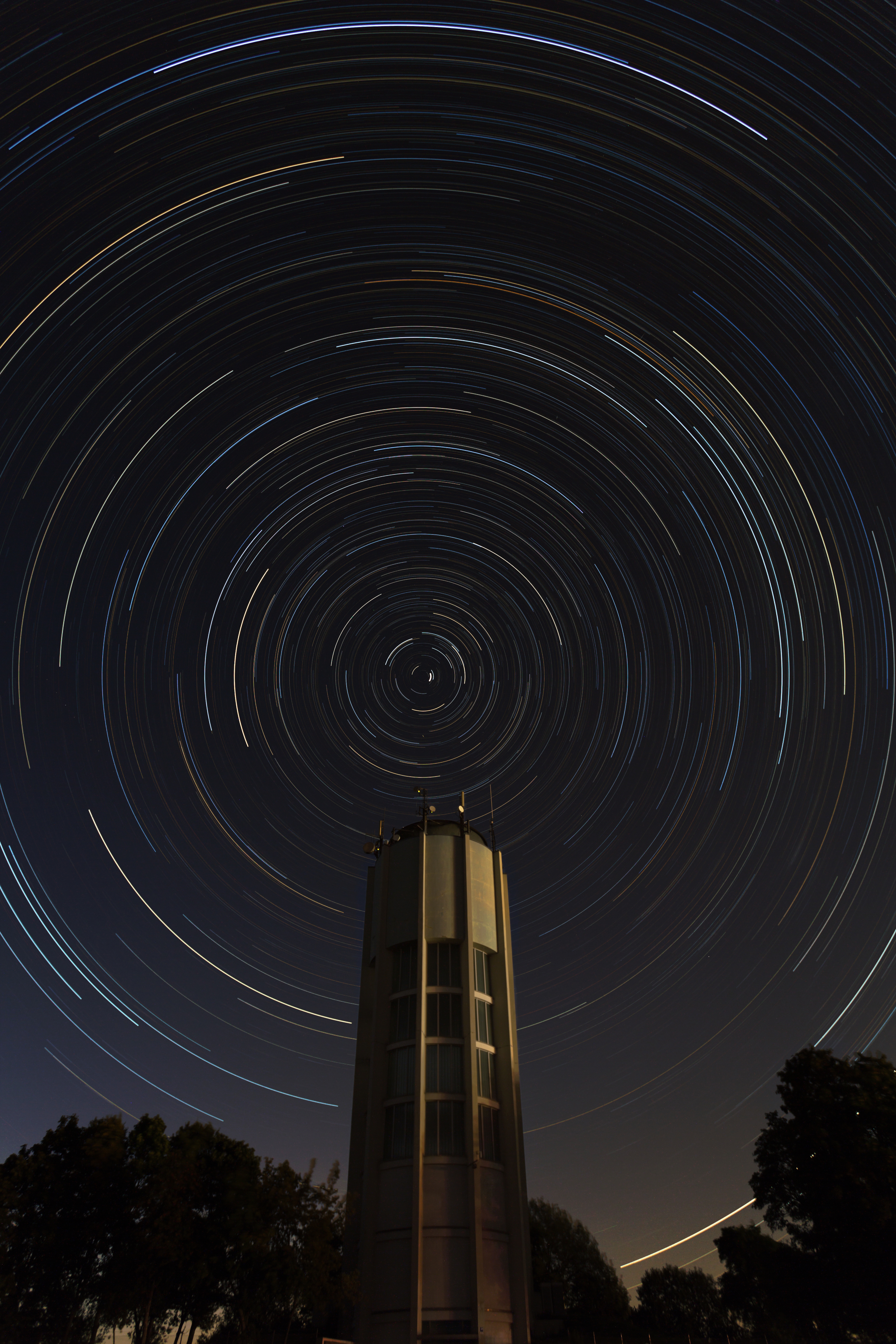 Die klaren und fast mondlosen Nächte und Urlaubszeit passten perfekt zusammen, um endlich mal wieder Astrofotos zu machen. Für die Startrails nach Norden habe ich mir den Wasserturm bei Oberjettingen, Baden-Württemberg ausgesucht. Dieses Bild besteht aus 45 Aufnahmen à 5 Minuten, also 3 h 45 m Gesamtbelichtungszeit. Bearbeitet mit Lightromm und zusammengesetzt mit StarStaX.