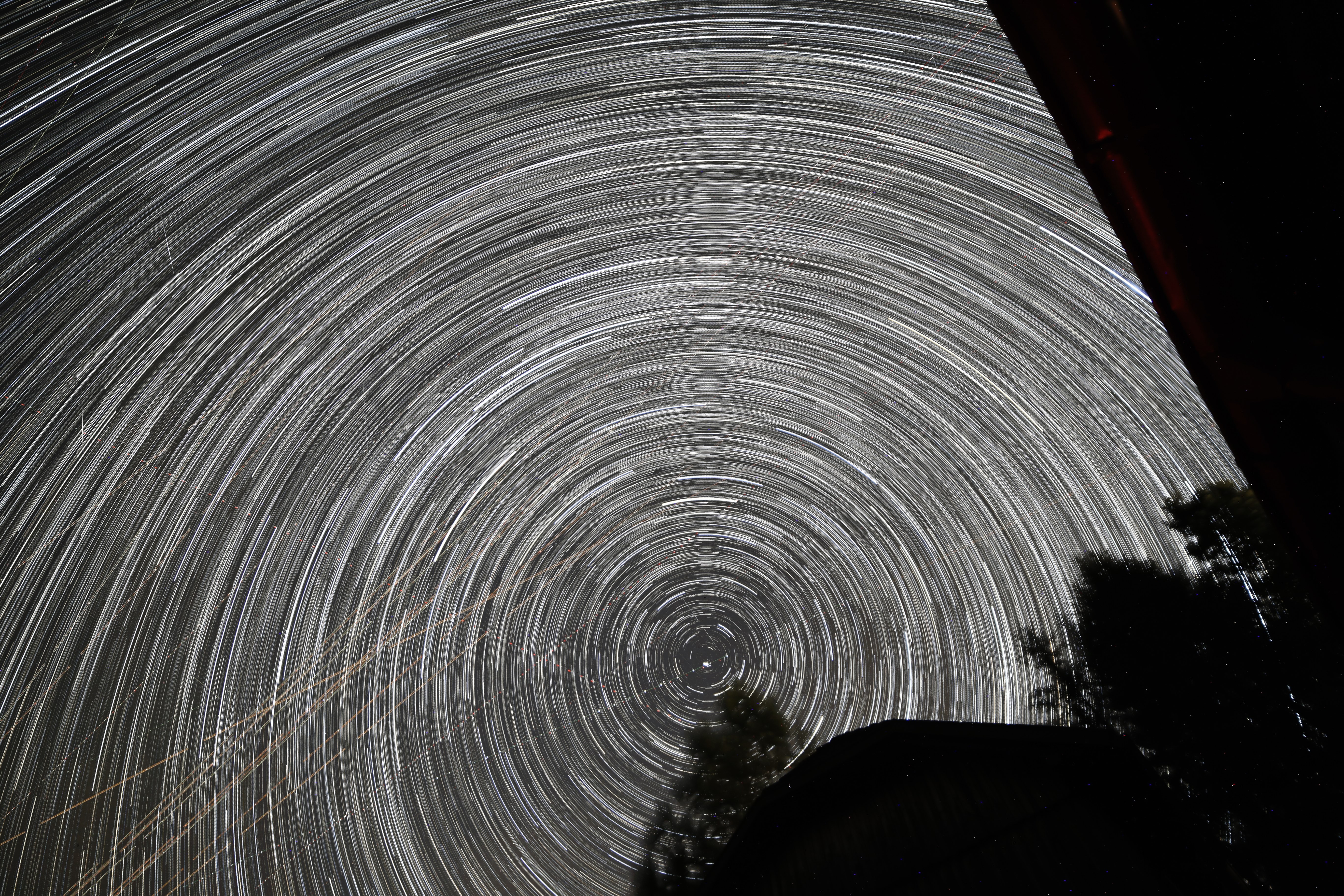 Aufnahmeserie aus 202 Bildern mit Canon EOS 6D und Walimex 14 mm von 23:42 bis 01:33 Uhr MESZ am 9. bis 10. Mai 2023. Die Serie wurde dann mit Startrails zu einer Strichspuraufnahme um den Himmelsnordpol verarbeitet.