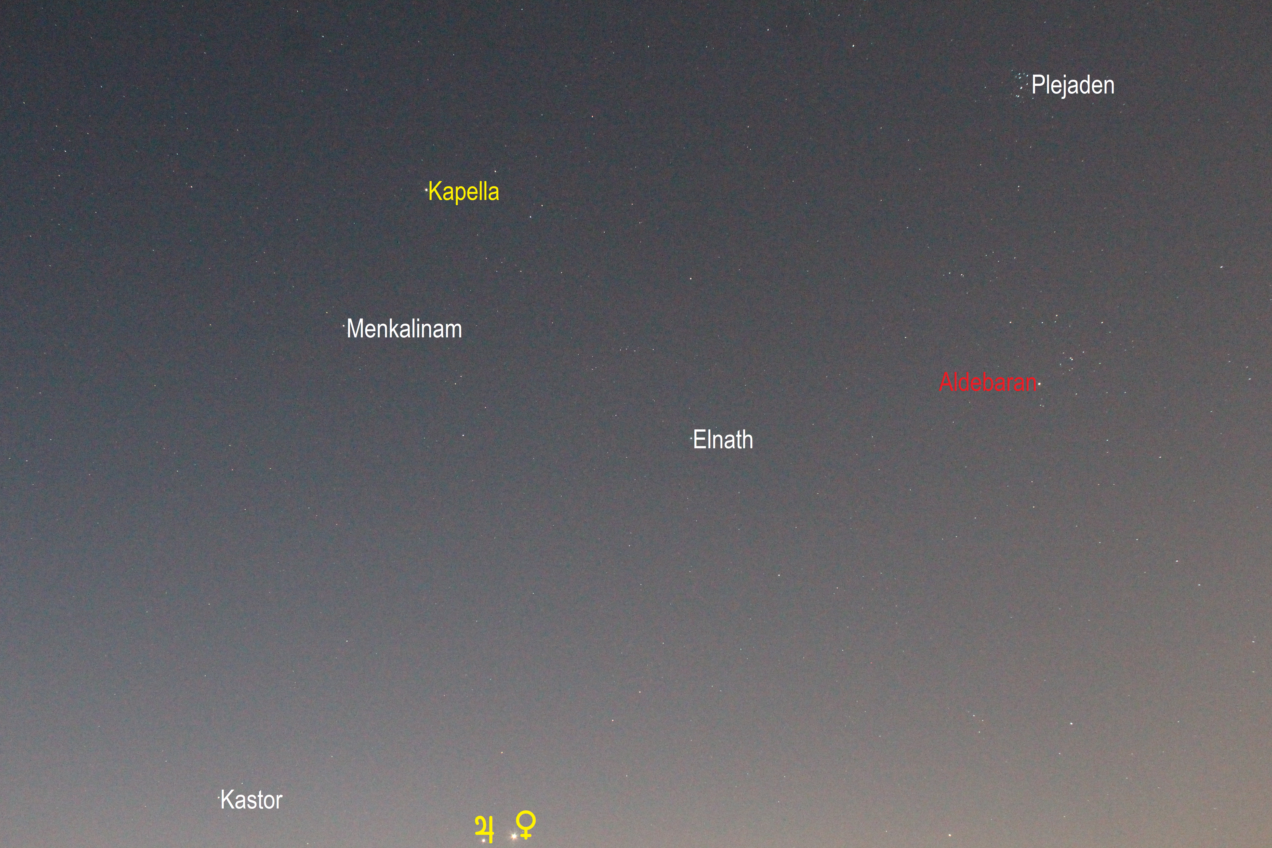 Leserbilder Astronomie: Stier, Fuhrmann und Teile der Zwillinge mit Venus und Jupiter (Objekte beschriftet)