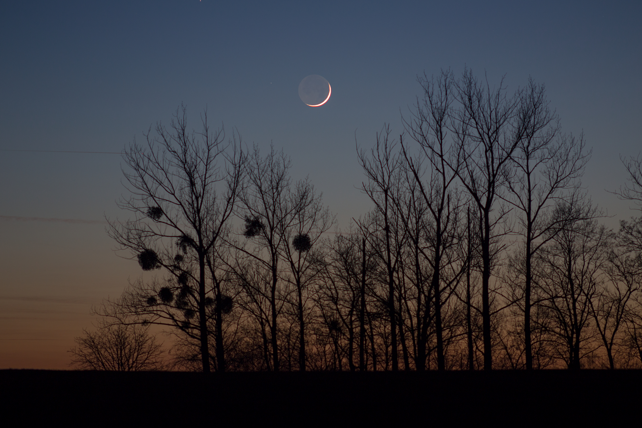 Am Abend des 20. Januar, als immer noch Polarlichter aktiv waren, tauchte über Südwest auch wieder die schmale, zunehmende Mondsichel auf. Genau 44h waren nach Neumond vergangen. Wunderschön war das aschgraue Licht zu sehen. Die Bäume auf dem Lerchenberg bei Börnchen mit ihren Misteln bieten immer wieder einen reizvollen Vordergrund.