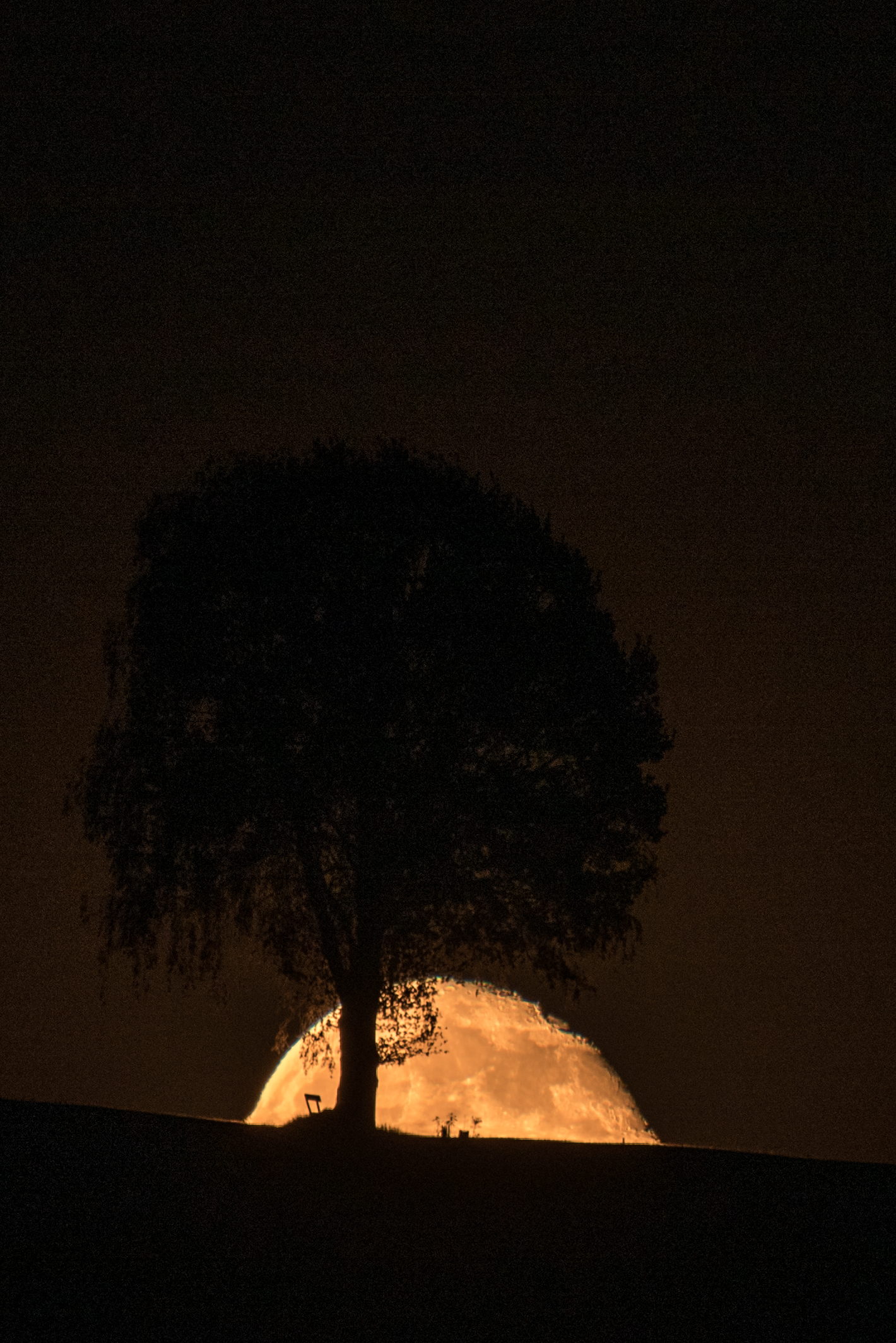 Zur Vollmondzeit mal ein stimmungsvolles Bild vom Aufgang unseres Trabanten. Von der Geländekante, auf der dieser Baum steht, hat man einen netten Blick über die Wiesen und Felder der Umgebung. Eine gezimmerte Bank, deren Lehne links neben dem Stamm sichtbar ist, lädt zum Verweilen ein...