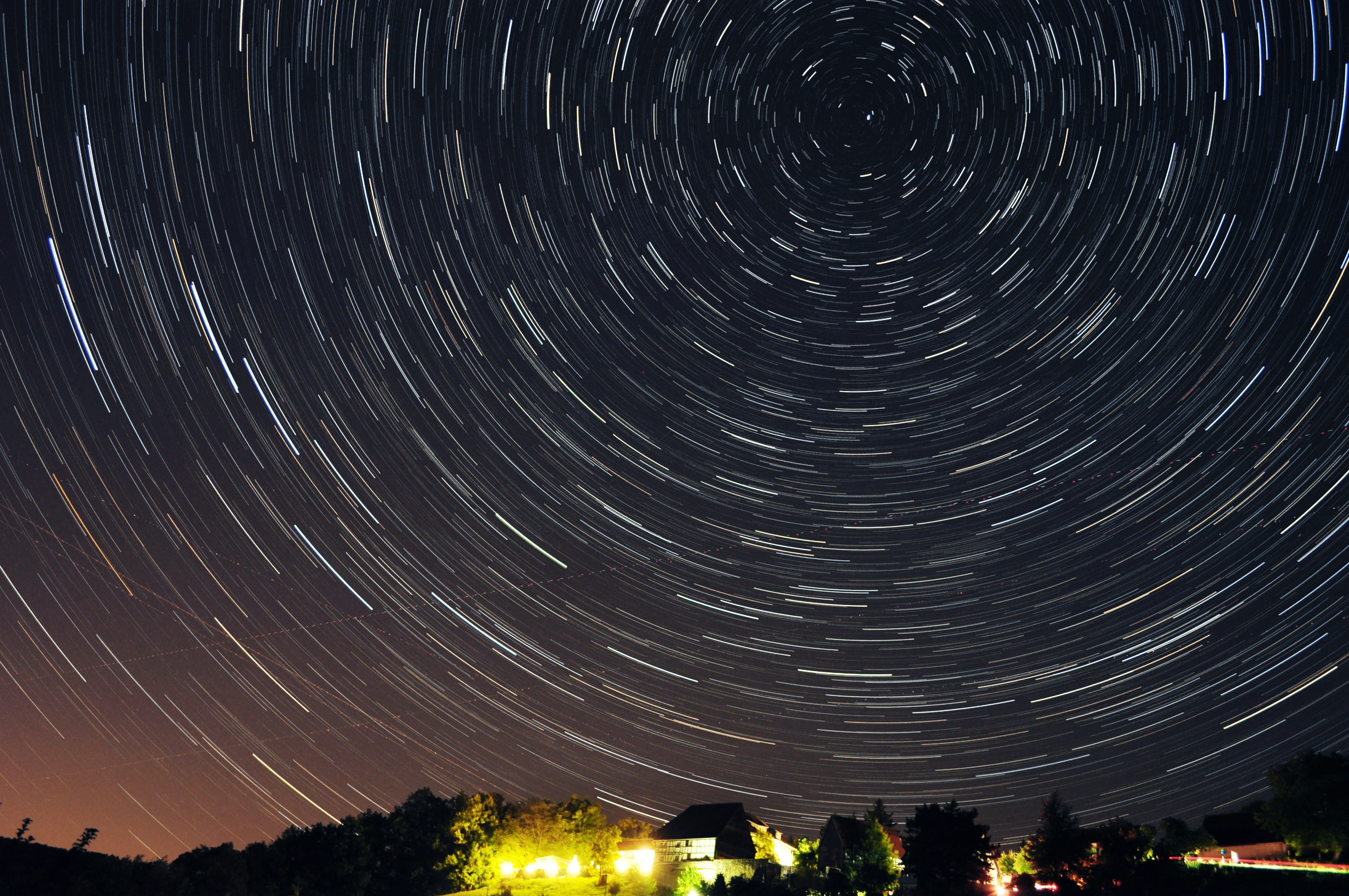 Der Himmelspol über der Burg Waldenstein. Einzelaufnahmen über einen Zeitraum von knapp 40 Minuten wurden hier zusammengefügt.