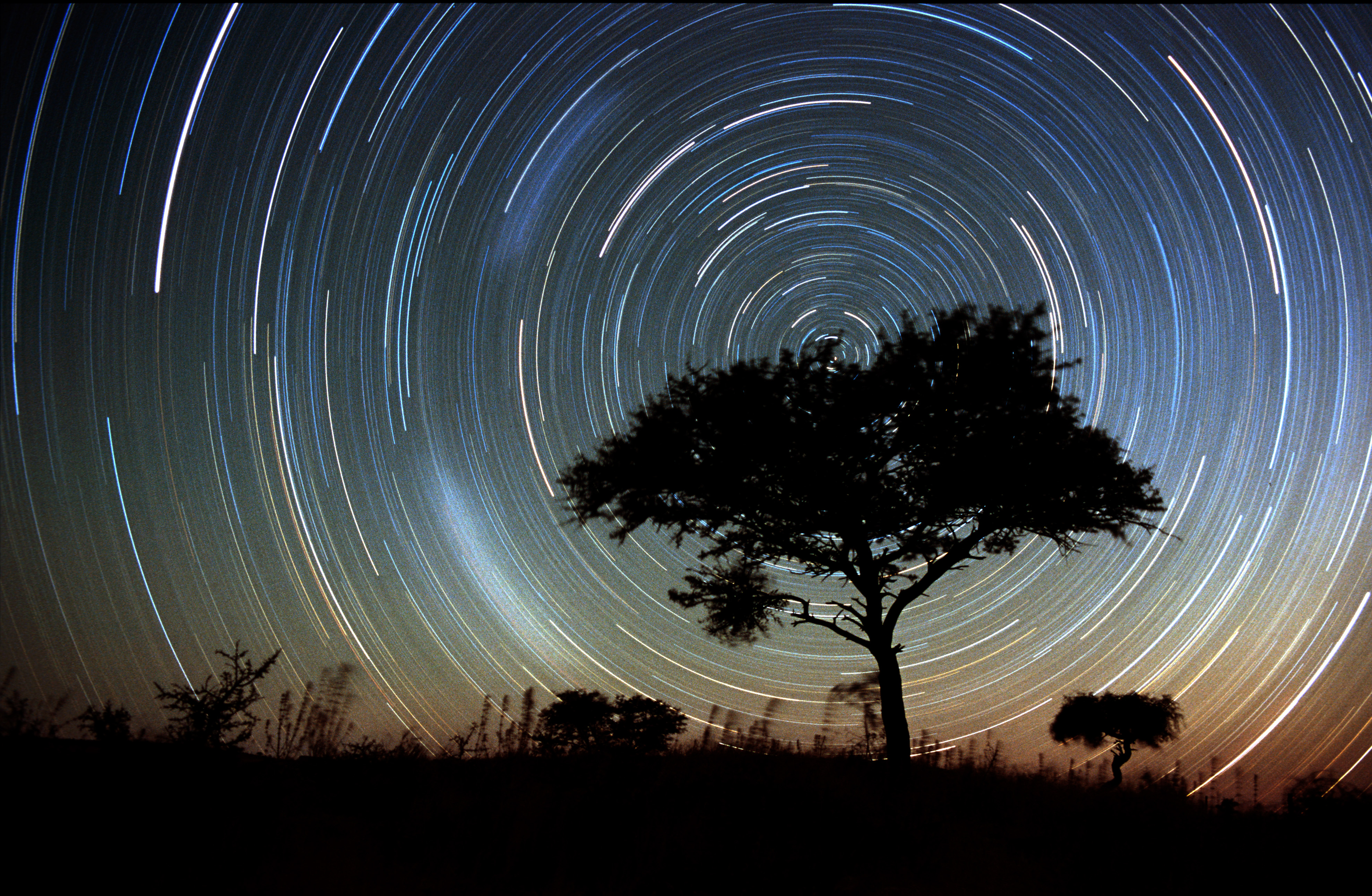 Strichspuraufnahme des südlichen Nachthimmels, aufgenommen in Namibia. Yashica mit Zeiss 28 mm, Blende 4,0 und Kodak-Diafilm E 200, 2 Stunden am Stück belichtet.