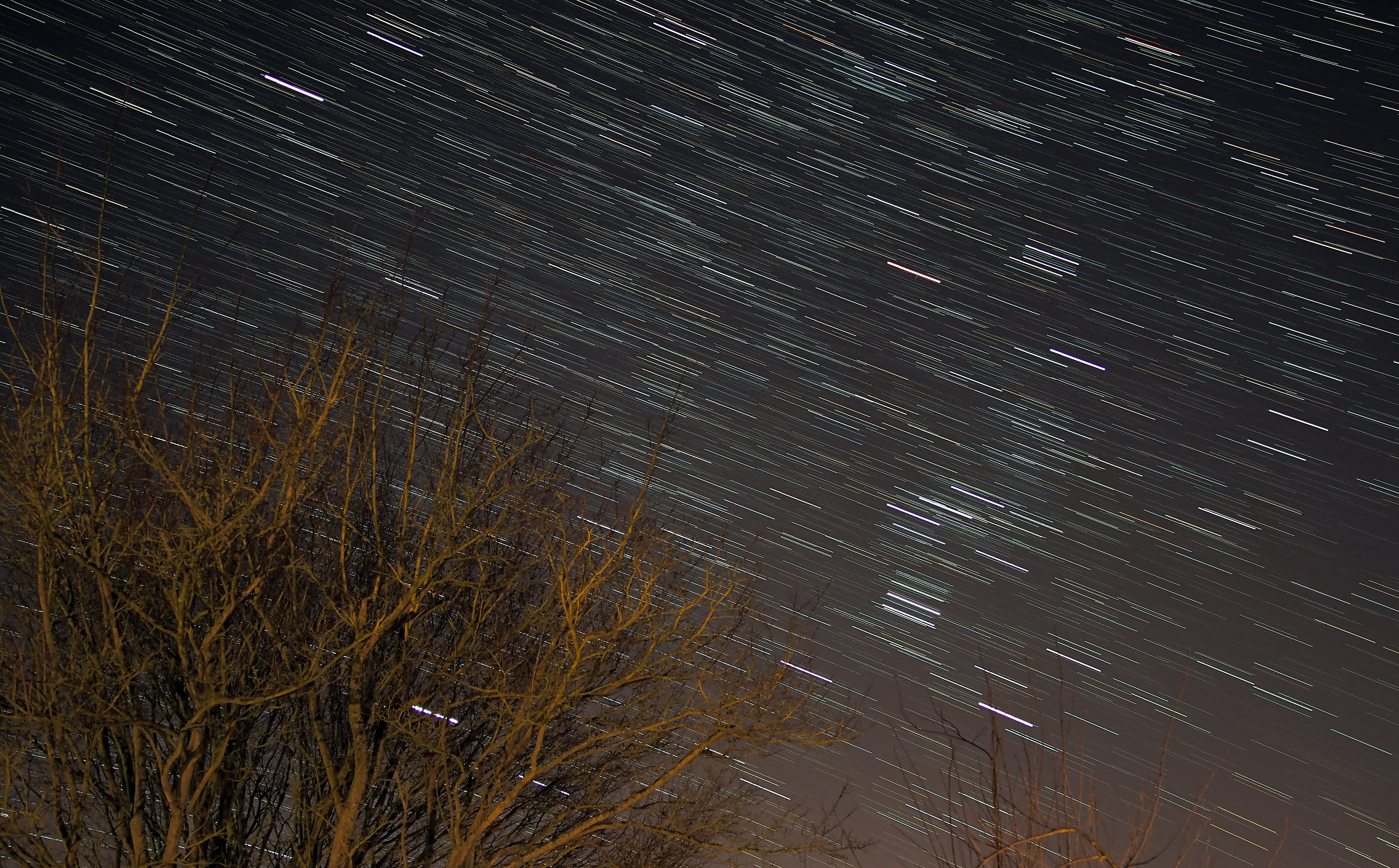 Bei diesem Foto habe ich mal eine Funktion meiner Olympus-Kamera ausprobiert, die sich Live Composite nennt. Sie ist sehr gut für Strichspuraufnahmen geeignet. Die Aufnahme entstand bei hoher Lichtverschmutzung mitten in Bochum. Es wurde bei Blende 2 und ISO 800 insgesamt 109x 5sec. belichtet (etwa 9 min.). Bei dieser Funktion der Olympus Kamera wird eine Referenzaufnahme für die Helligkeit aufgenommen (5 sec.) und bei allen anderen Aufnahmen werden nur NEU hinzukommende Helligkeiten registriert.