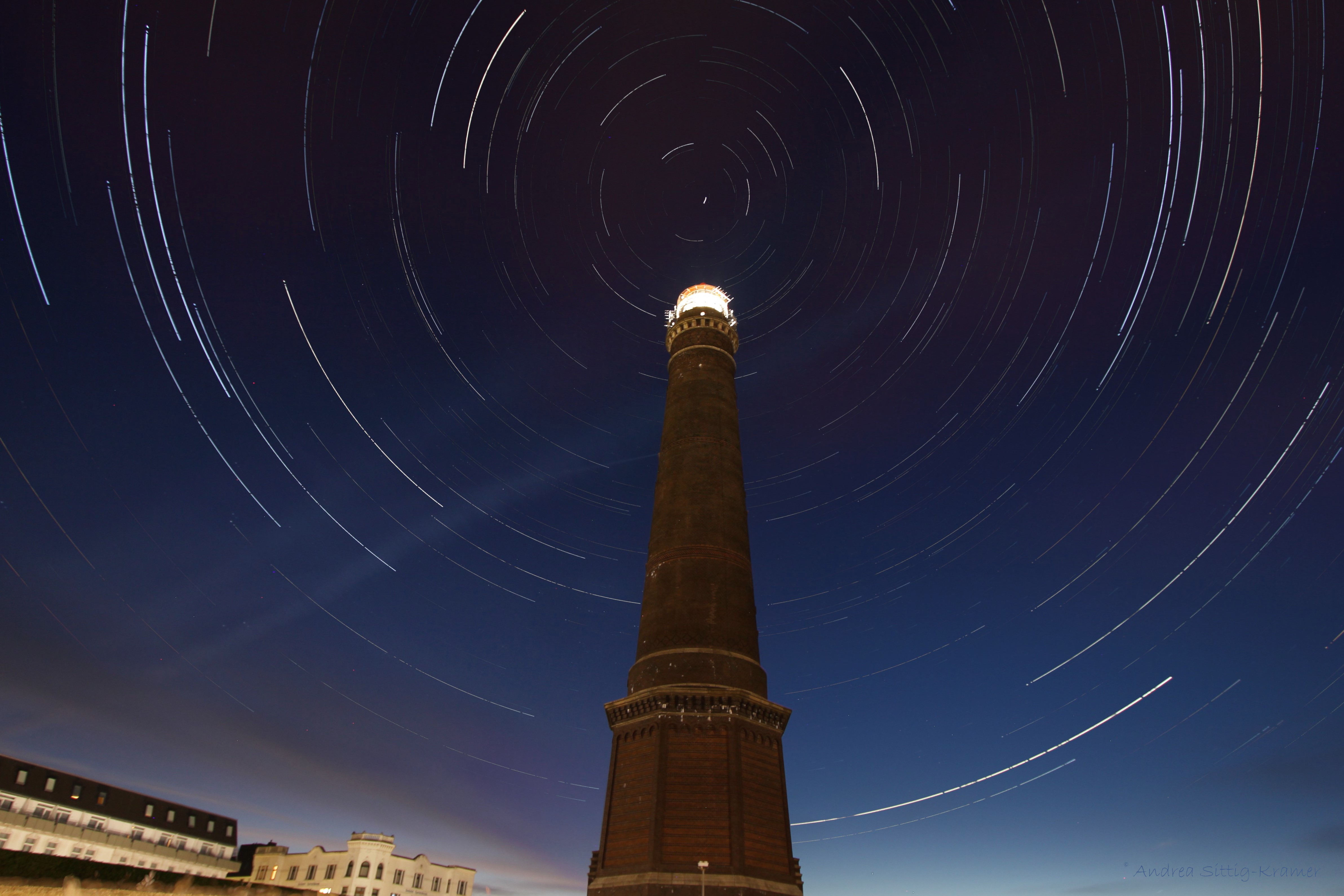 Am 7. Juli 2018 war die kurze weiße Nacht auf Borkum nahezu sternenklar. Ich habe die Zeit nach Mitternacht genutzt, um ein Strichspurenbild mit dem Neuen Leuchtturm im Vordergrund zu erstellen. Die Kamera konnte ich so ausrichten, dass der Nordstern exakt über der Turmspitze positioniert ist. Die Gesamtbelichtungszeit beträgt gut 2¼ Stunden.