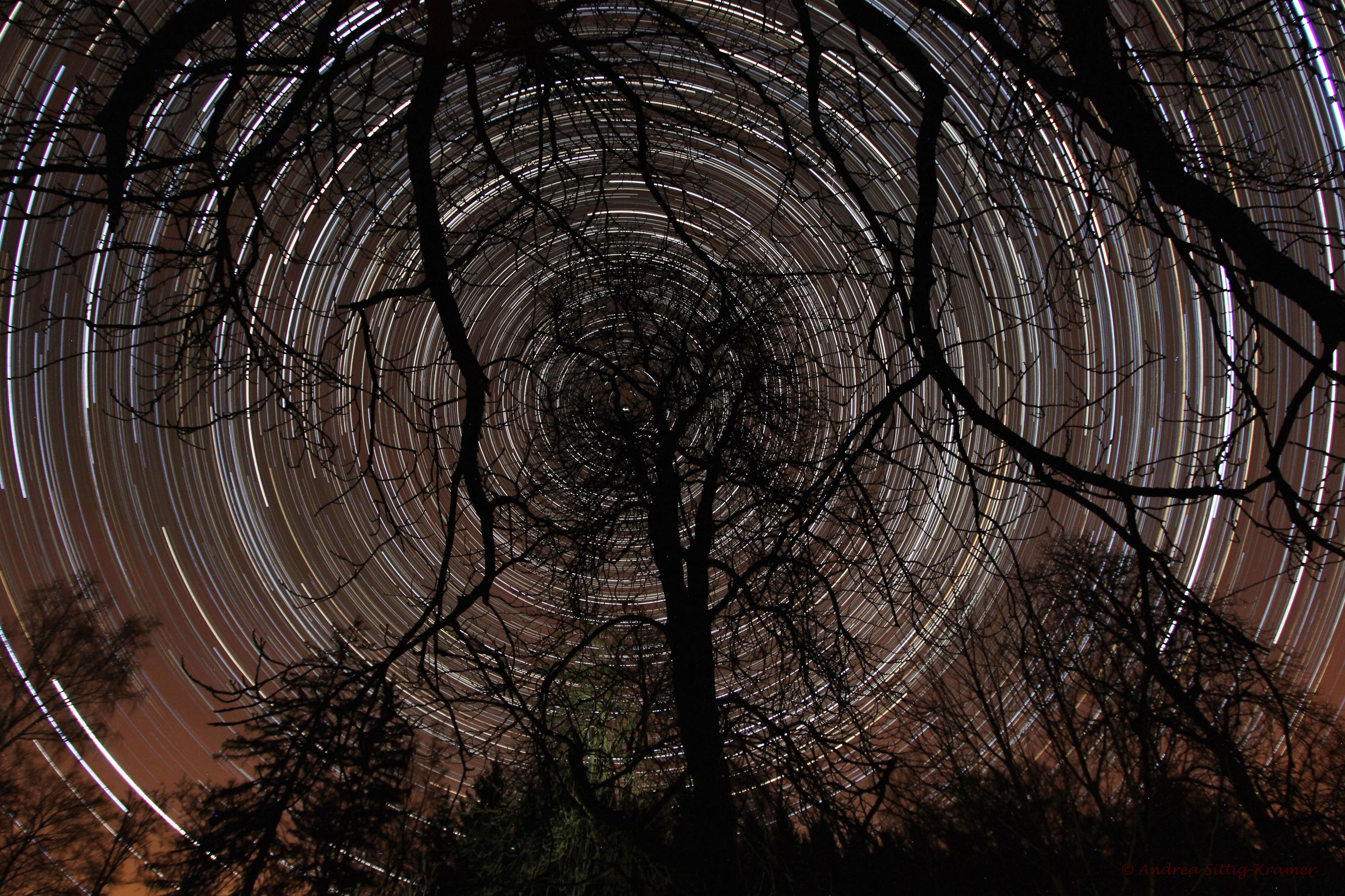 Mit dem Programm „Startrails“ fügte ich die Einzelaufnahmen zu dem Strichspurenbild zusammen. Es herrschte absolute Windstille, so dass die Baumwipfel in der Bildmitte auch auf dem Summenbild scharf abgebildet sind.