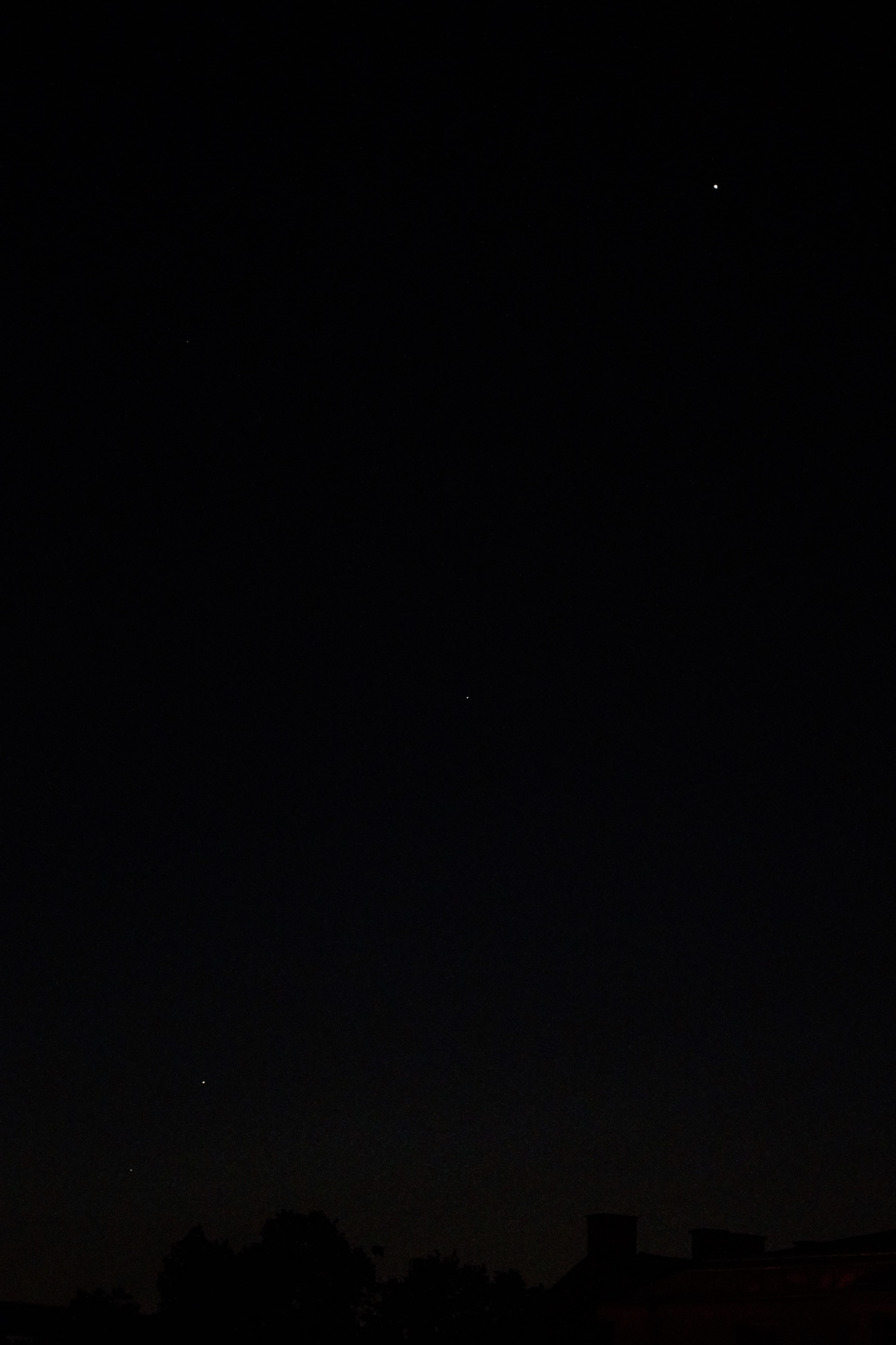 Wenige Minuten, nachdem die ISS um 5:22 Uhr MESZ über Wien hinweg gezogen war, bildeten Mars, Merkur (links unten), Regulus (Mitte) und die Venus (rechts oben) eine Perlenkette am morgendlichen Himmel.