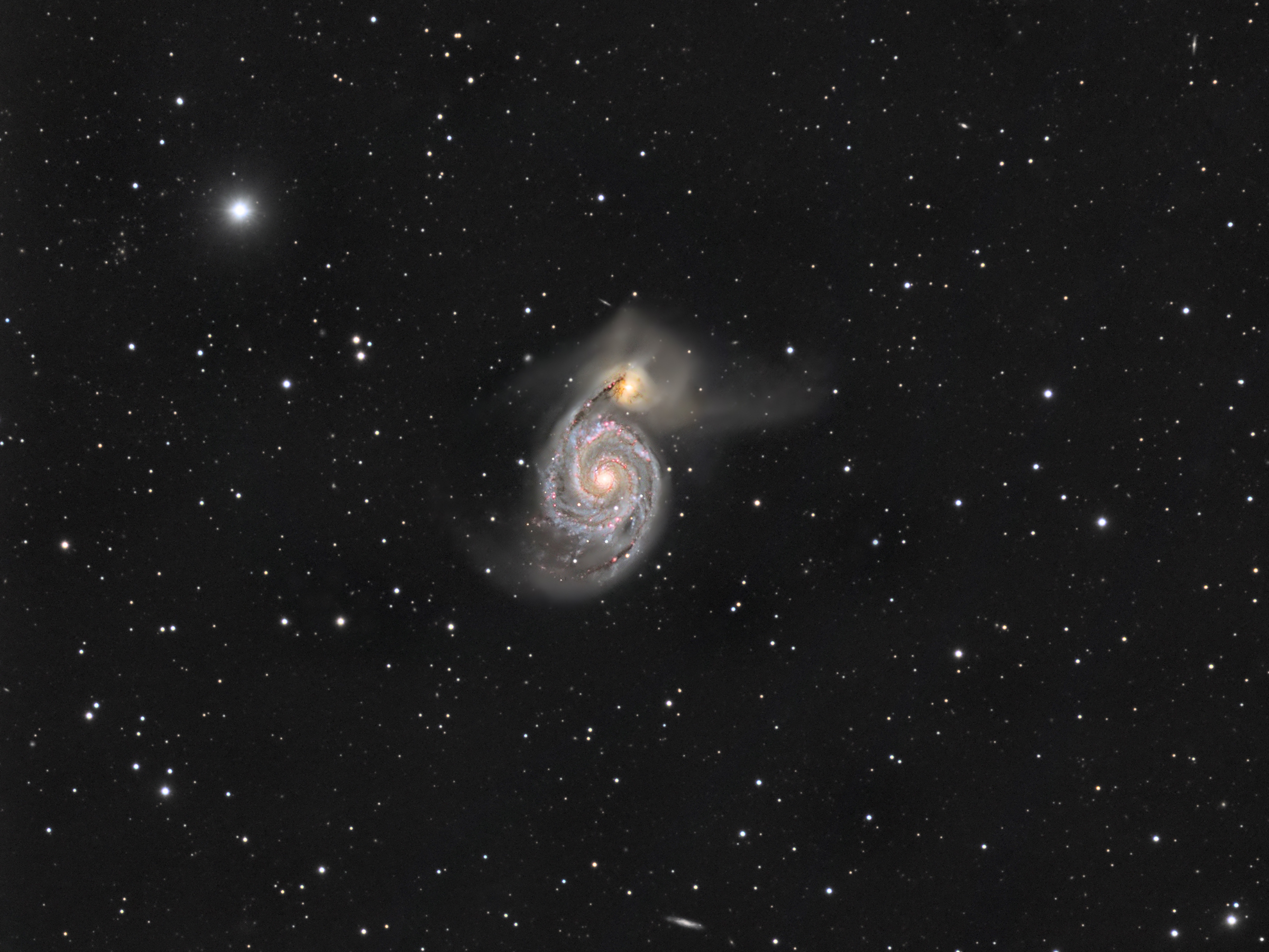 In zwei feuchten Märznächten gelang es, diese in sich verschlungenen Galaxien mit etwas mehr Tiefe aufzunehmen. Insgesamt wurde mehr als zehn Stunden belichtet. Neben Details um den Kern der Galaxie und in den Spiralarmen kann man auch den Gezeitenstrom des Galaxienpaares erkennen.