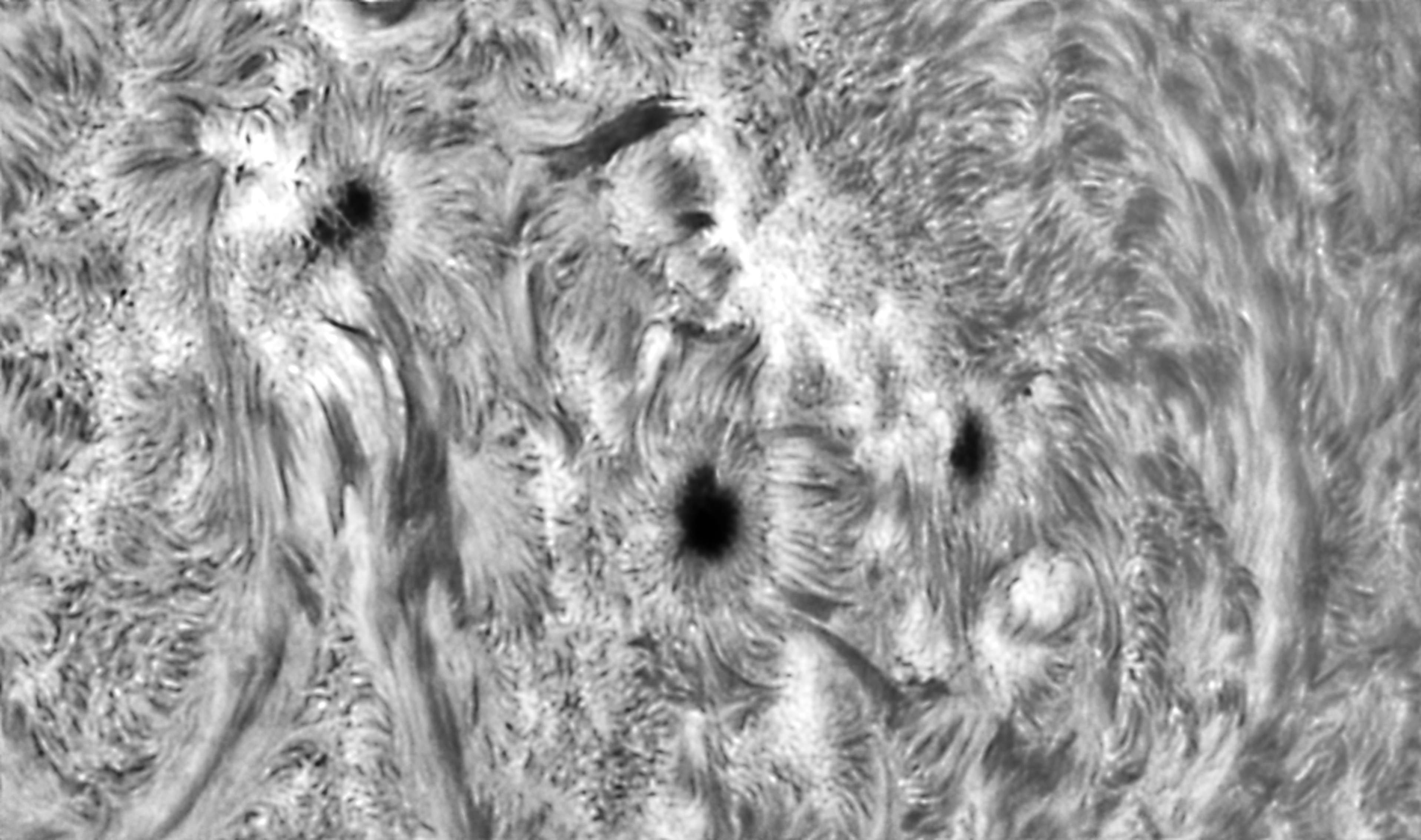 Am Vormittag des 26. Mai war der Himmel noch fast wolkenfrei und das Seeing auffällig gut. So wagte ich mich an diese Detailstudie der Fleckengruppe 3685, indem ich nur einen Teil des Kamerasensors und den Vergrößerungseffekt nutzte.