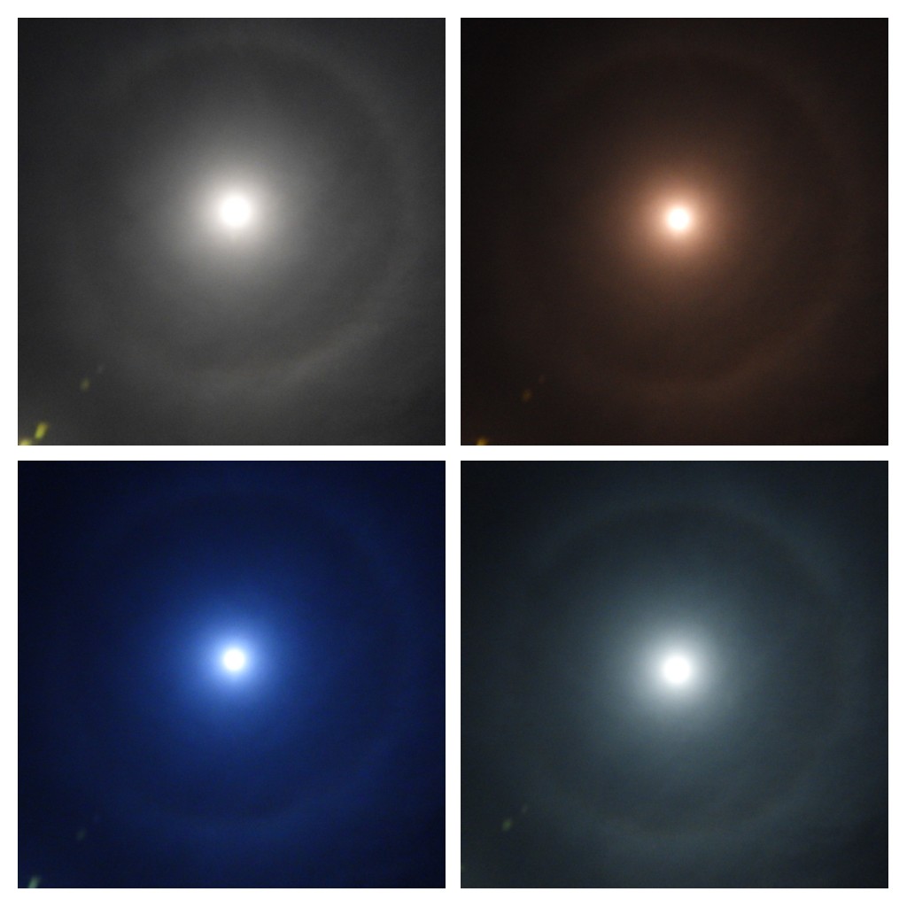Der Halo, war am 9. Februar 2020 kurz nach Mitternacht um den Sturmmond zu sehen, der zu diesem Zeitpunkt auch mit der geringsten Entfernung zur Erde ein Super-Vollmond ist. Die Aufnahmen wurden mit verschiedenen Farbfiltern aufgenommen und links unten entstanden leider durch eine Straßenlaterne Lichtpunkte.