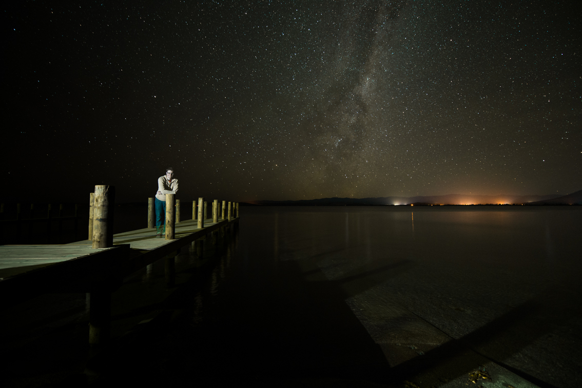 Dieses Bild (Nikon D800, 14-24 mm, Blende 2,8, 30 Sekunden Belichtung, der Vordergrund wurde seitlich mit einem Blitzlicht erhellt) zeigt meinen Sohn vor dem östlichen Himmel mit einer schönen südlichen Milchstraße.
