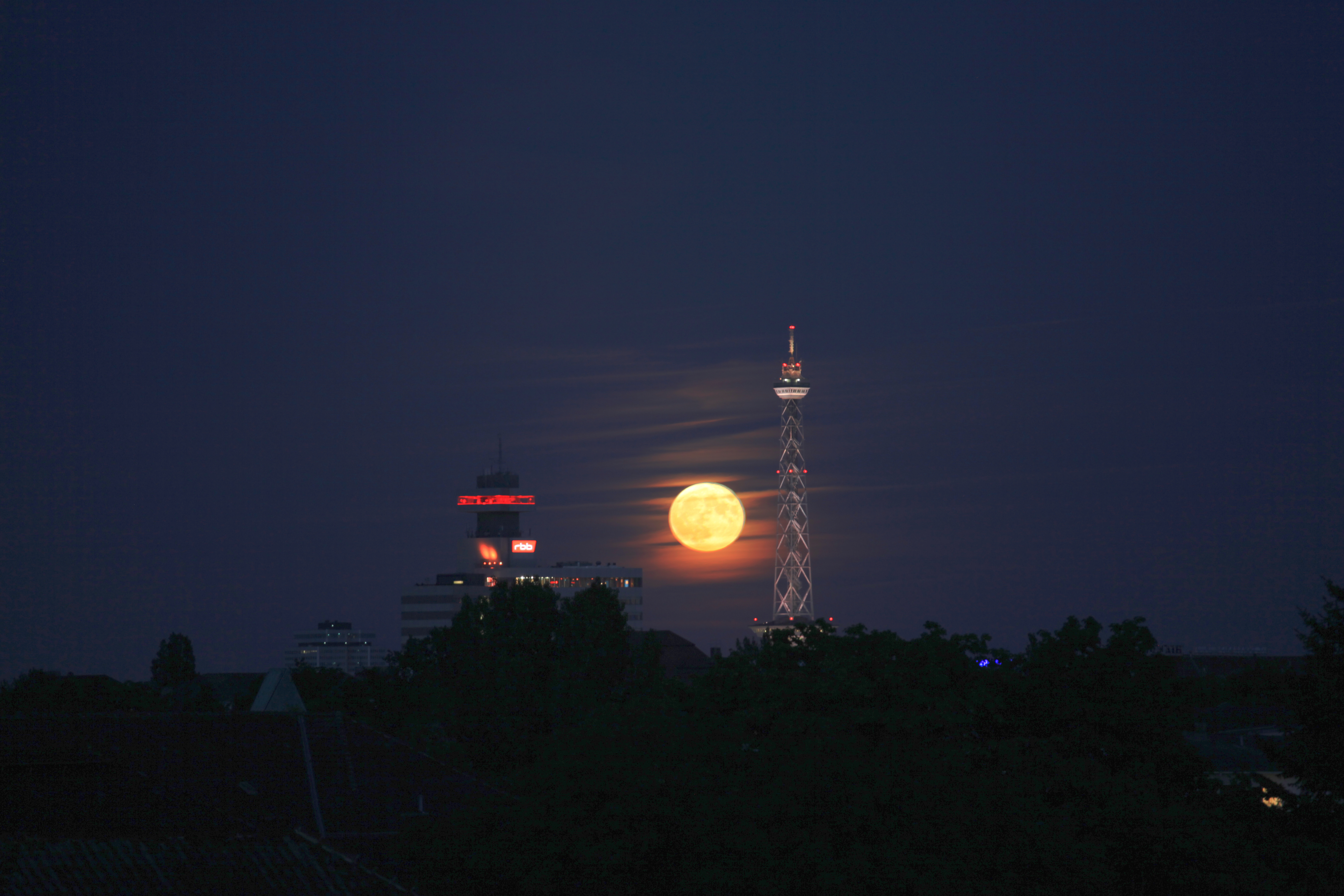 Der sich fast in Erdnähe befindende Vollmond geht zwischen dem Berliner Funkturm und dem RBB-Sendezentrum auf.