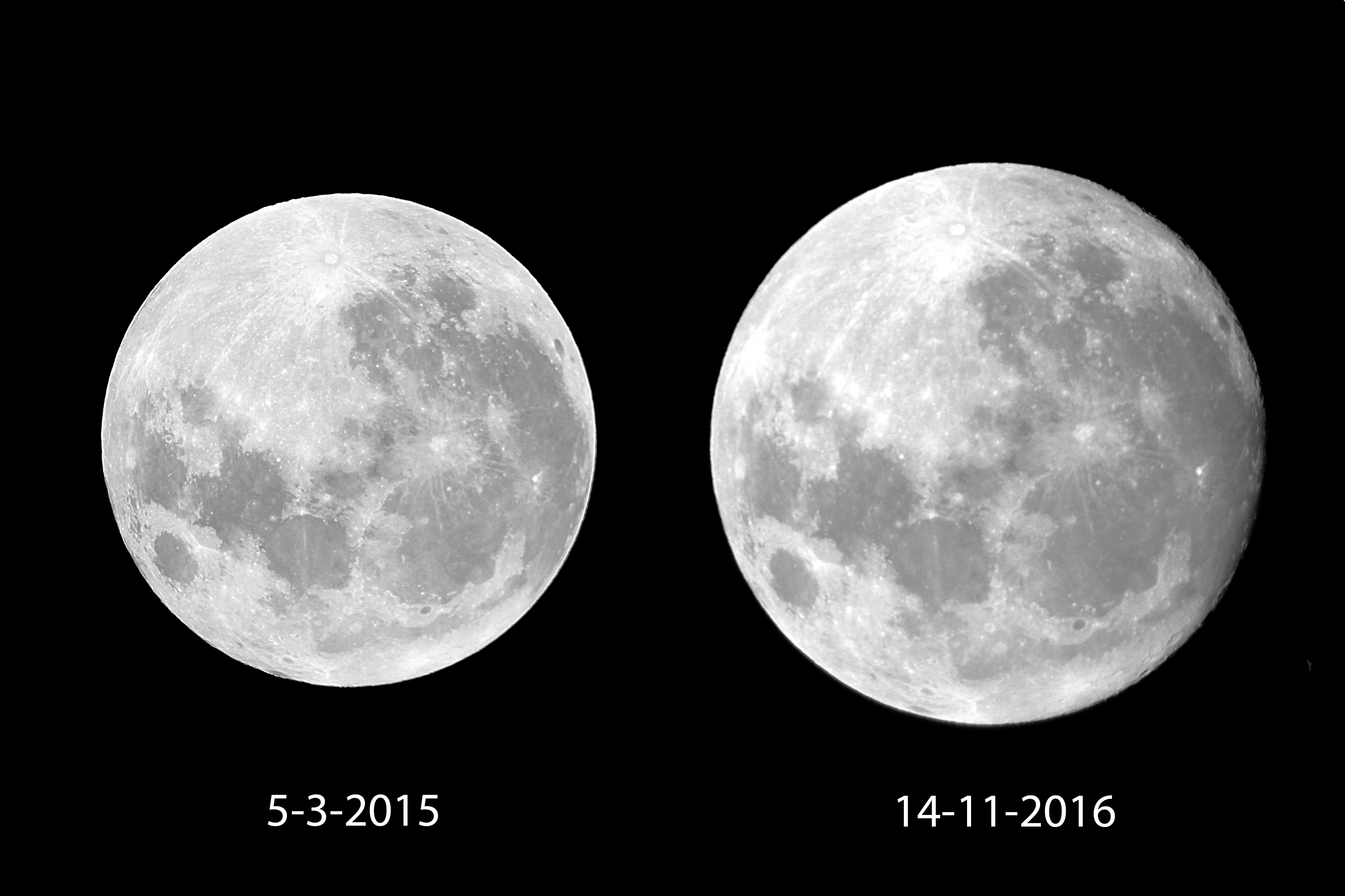 Am 13. November 2016 war es bei uns klar, da habe ich mal geübt für den Supermond. Am 14. war es bewölkt. Darum dieses Bild. Ein Vergleich des größten und des kleinsten Mond.