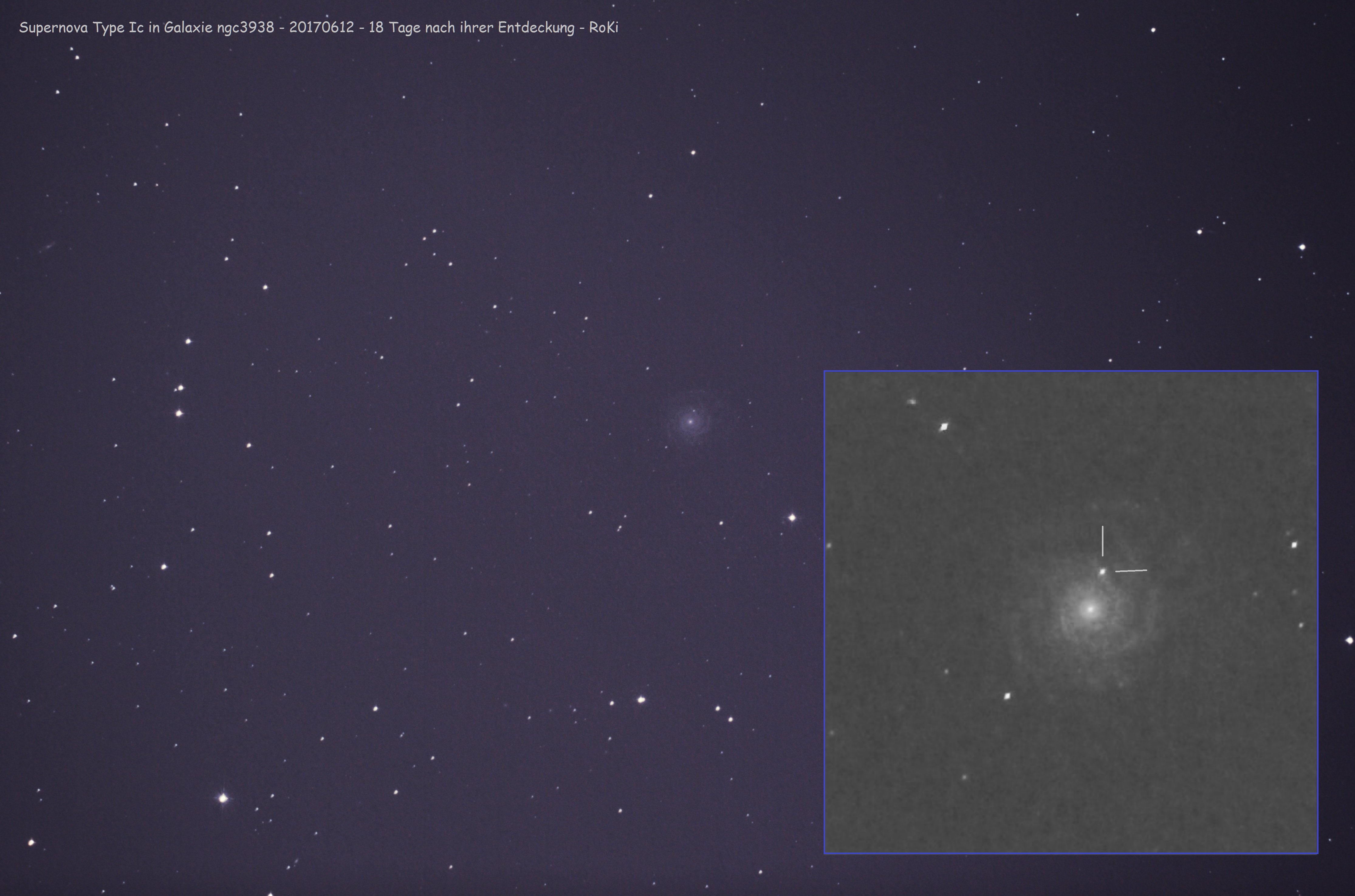 In der Galaxie NGC 3938, welche 1788 von William Herschel entdeckt wurde, leuchtete vor 18 Tagen eine Supernova vom Typ Ic auf. Zur Zeit ist sie in dieser 45 Millionen Lichtjahre entfernten Galaxie gut sichtbar. Leider wird es zur Zeit erst gegen Mitternacht dunkel … wenn überhaupt!