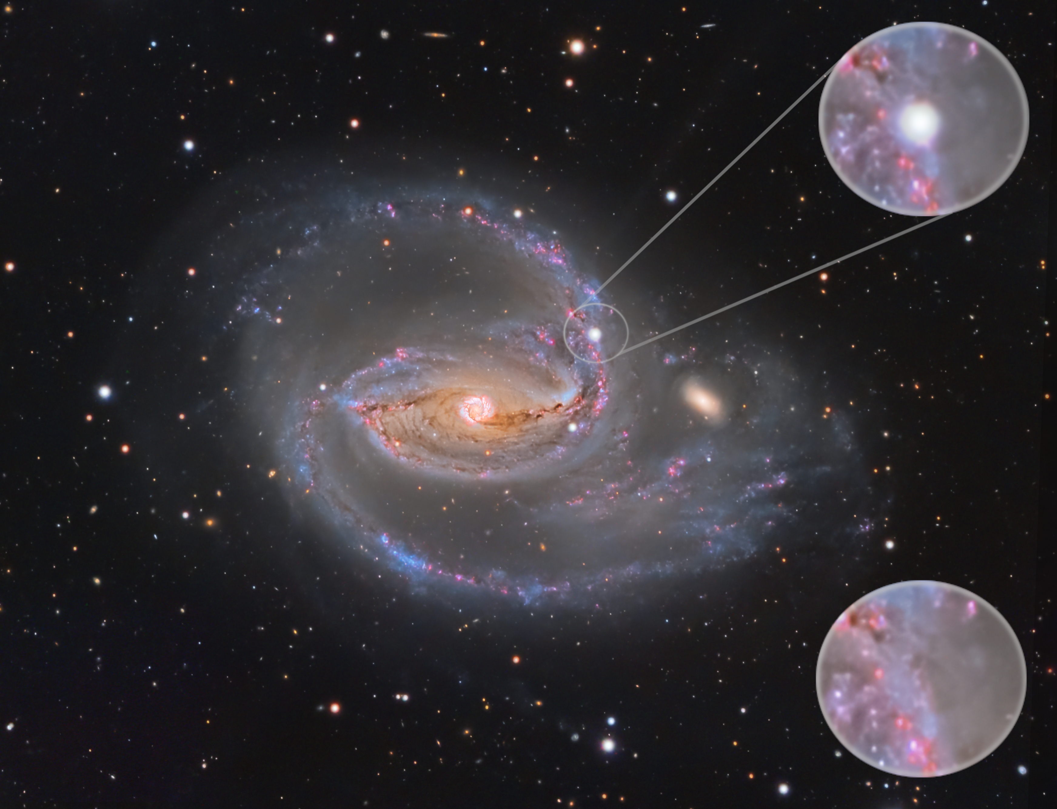Im Anhang sehen Sie NGC1097 (Spitzname »Das Auge des Horus«), eine Seyfert-Galaxie im südlichen Sternbild Fornax. Eine neue helle Supernova vom Typ II (2023rve) wurde am 9. September 2023 entdeckt: Sie befindet sich 11,9 Bogensekunden westlich und 127,4 Bogensekunden nördlich des Zentrums von NGC1097. Zum Zeitpunkt der Entdeckung betrug die Helligkeit 13,9 mag. Dieses Bild wurde sechs Tage nach der Entdeckung, am 14. September 2023, mit einem ASA Newton 500mm f/3.8 aus Rio Hurtado, Chile, aufgenommen. Das endgültige Bild ist eine Komposit mit einer anderen Sitzung, aufgenommen im Januar 2023 mit RC1000 f/6.8: In den runden Kästchen gibt es einen Vergleich zwischen dem Spiralarm vor und nach dem katastrophalen Ereignis.