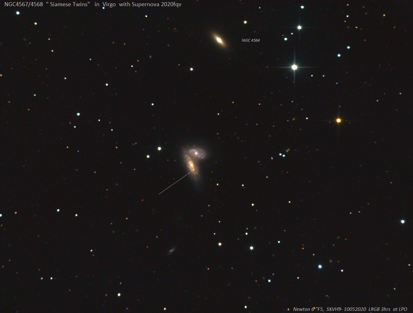 Nicht oft kommt es vor, dass eine SN in einer von zwei benachbarten Galaxien sichtbar wird, wie hier in den "Siamesischen Zwillingen" NGC 4567/68 aufgenommen mit einem 6-Zoll, F5-Newton in drei Stunden.