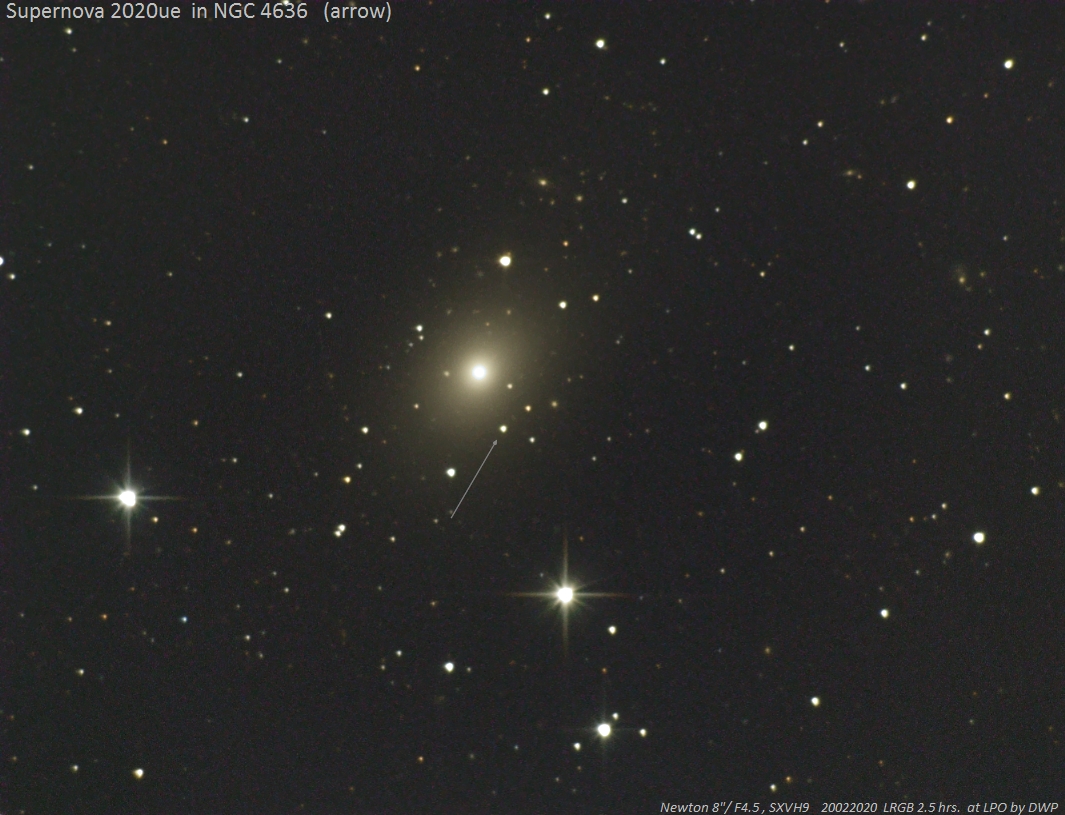 Die Supernova SN2020ue in 4636 war im 9"-Takahashi TSC bei V = 180x leicht zu sehen. Trotz tiefen Stands im Südosten gelang diese Aufnahme.