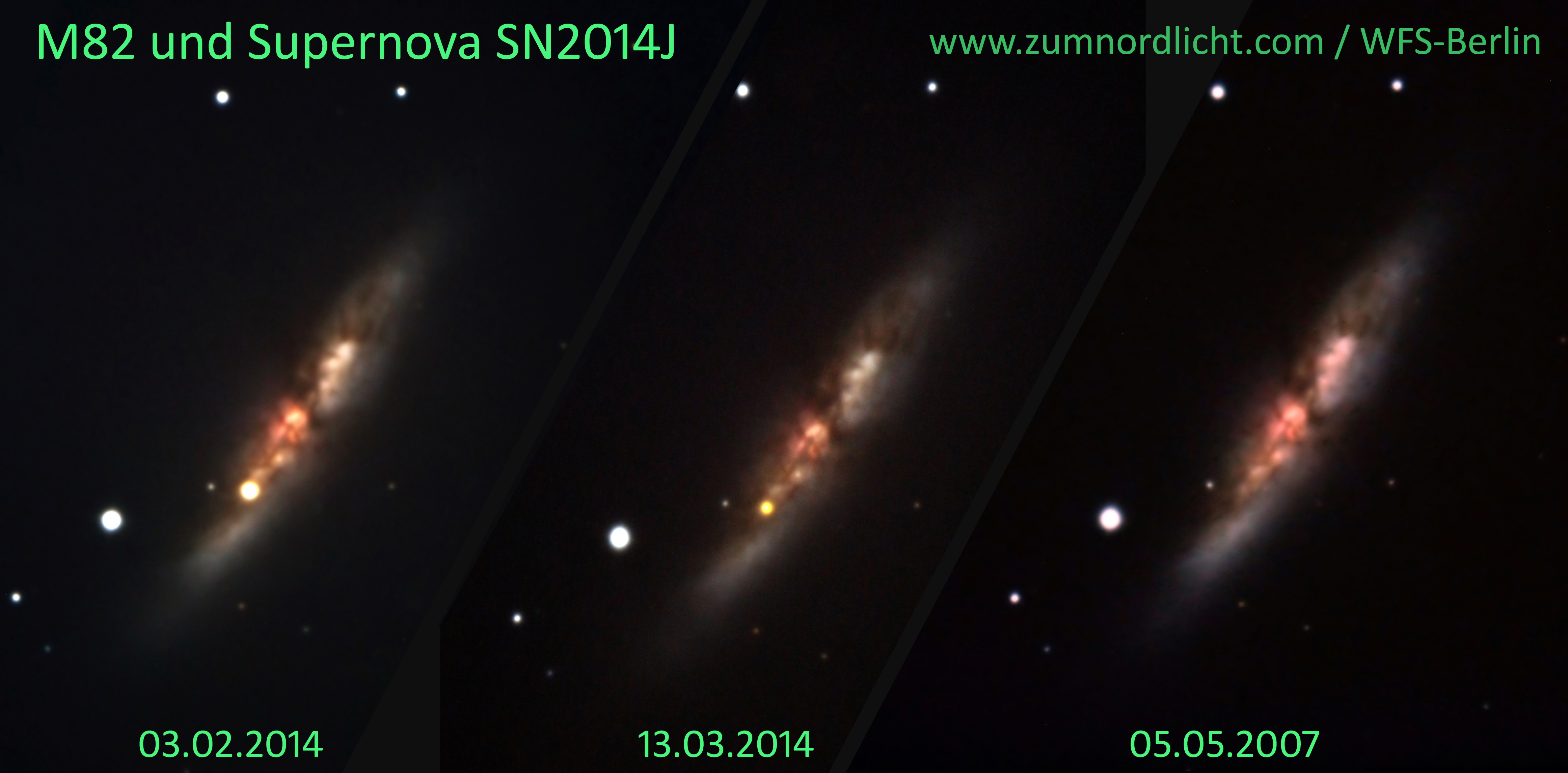 Das Dreifachbild zeigt die Galaxie M 82 mit der Supernova SN 2014J zu verschiedenen Zeitpunkten. Links ist die Supernova während ihrer maximalen Helligkeit zu sehen. In der Mitte ist sie bereits deutlich lichtschwächer. Rechts ist die Galaxie im Jahre 2007 ohne Supernova zu sehen. Alle Bilder habe ich mit dem 700/5600-mm-Ritchéy-Chretien-Teleskop der Wilhelm-Förster-Sternwarte in Berlin aufgenommen.