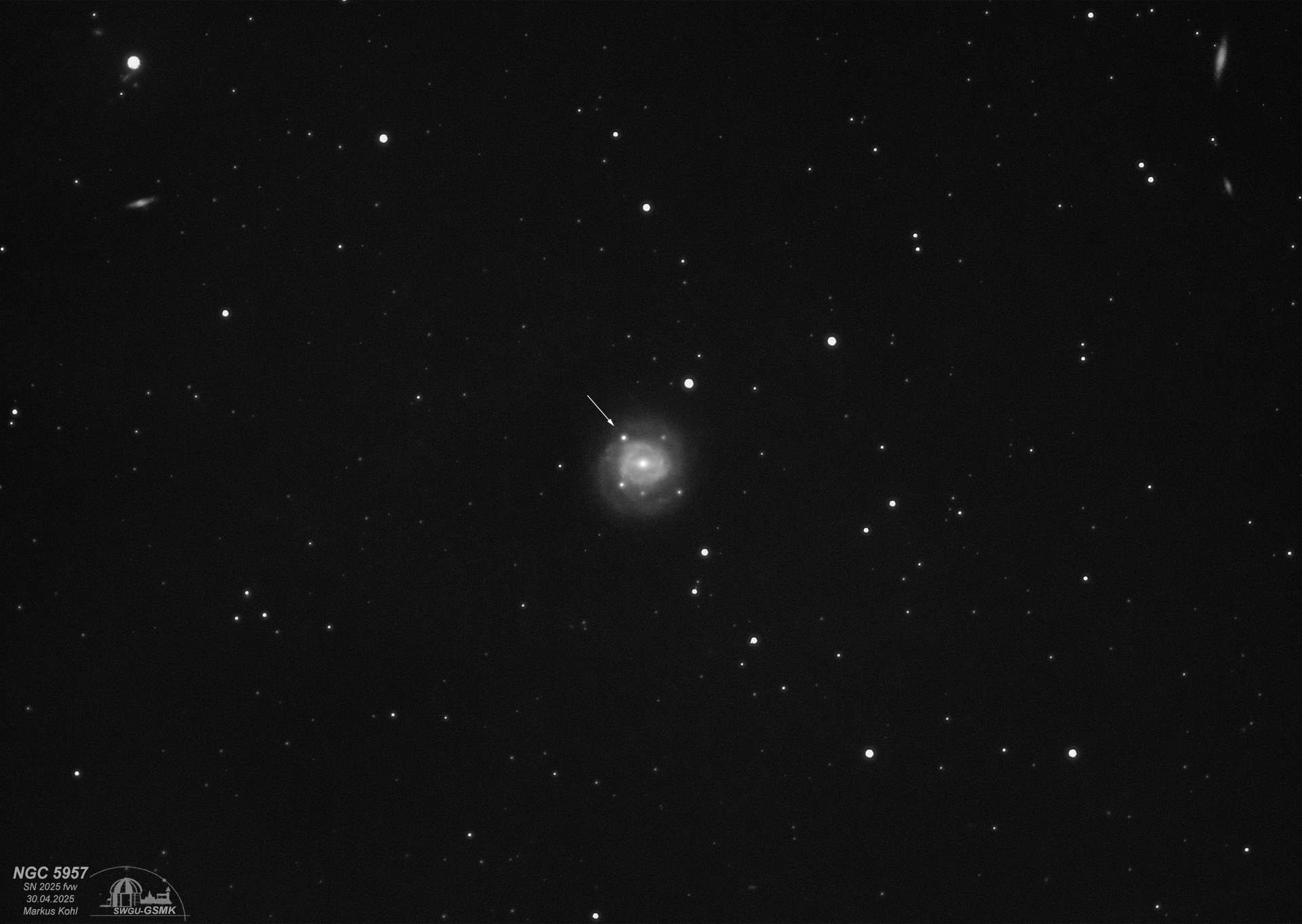 Nach einigen Problemen mit dem Temperaturausgleich des Fokussierers habe ich am 30. April 2025 einige Luminanz-Bilder von diesem Objekt machen können. Die Sterne sind etwas nachgeschärft, weil sie in der Serie allmählich zu richtigen Flecken geworden sind. Die Galaxie NGC 5957 ist eine ist eine 12,1 mag helle Balken-Spiralgalaxie vom Hubble-Typ SBb mit aktivem Galaxienkern im Sternbild Schlange nördlich der Ekliptik. Die Supernova wurde am 26. März 2025 von Koichi Itagaki entdeckt, der in der Szene mittlerweile schon zu den bekannten Persönlichkeiten gehört. Ich habe 33 x 300s bei Gain 0 und -15°C Sensortemperatur mit einer ASI 533 mono nur in L bei 1050 mm Brennweite fotografiert. Die immerhin 165 Minuten verwendeter Einzelbilder reichten dennoch nicht für ein völlig rauscharmes Ergebnis. Aber die SN ist registriert. Die Helligkeit dürfte aktuell um die 14,9 mag liegen.